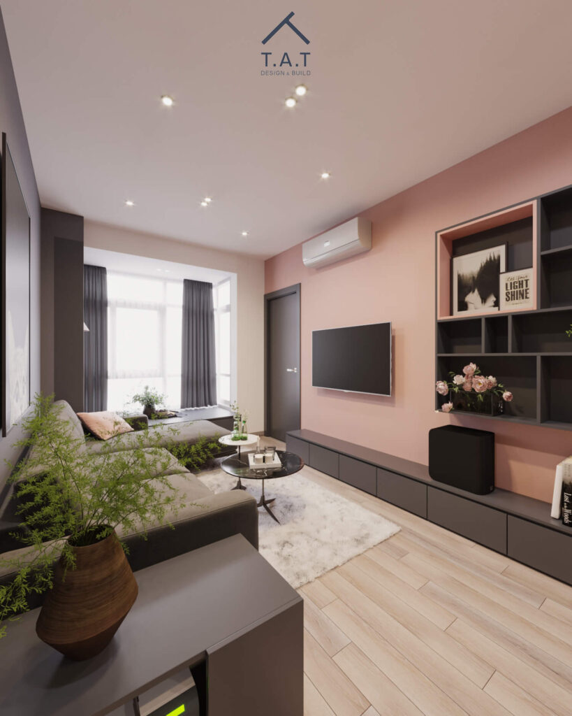 Mảng tường hồng mang lại cảm giác ấm áp, mềm mại, trong khi hệ tủ và sofa xám đậm giúp cân bằng thị giác, làm tổng thể không bị “quá ngọt”. Sàn gỗ sáng màu đóng vai trò trung hòa, kết nối các khu vực lại với nhau.