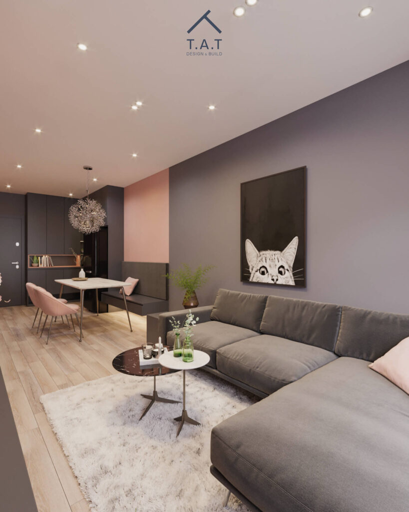 Không gian căn hộ mang phong cách hiện đại với tông hồng pastel và xám đậm làm chủ đạo, tạo cảm giác nhẹ nhàng nhưng vẫn cá tính.