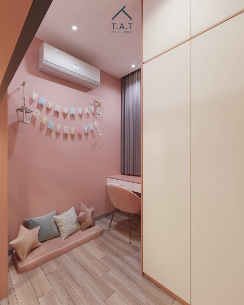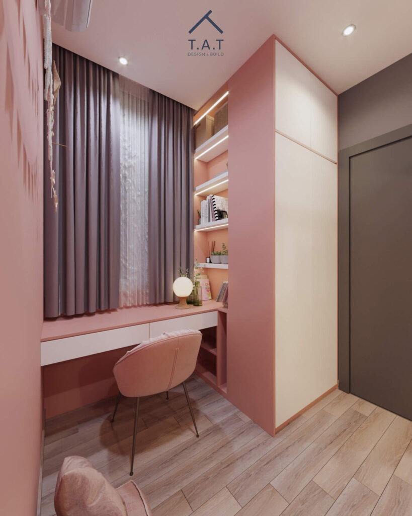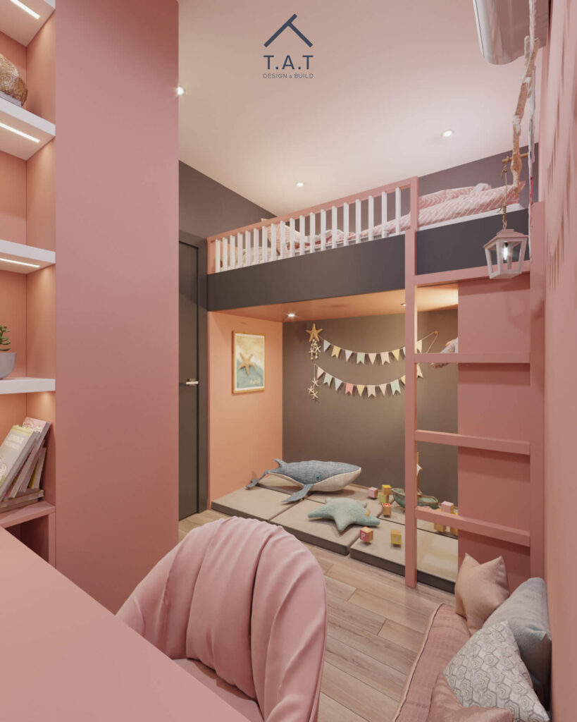 Không gian sử dụng tông hồng đất làm màu chủ đạo, tạo cảm giác ấm áp, dịu nhẹ và phù hợp với phòng ngủ trẻ em. Sắc hồng được cân bằng bằng các mảng xám đậm ở tường và rèm, cùng hệ tủ trắng kem giúp tổng thể không bị quá “ngọt” mà vẫn hiện đại, tinh tế.