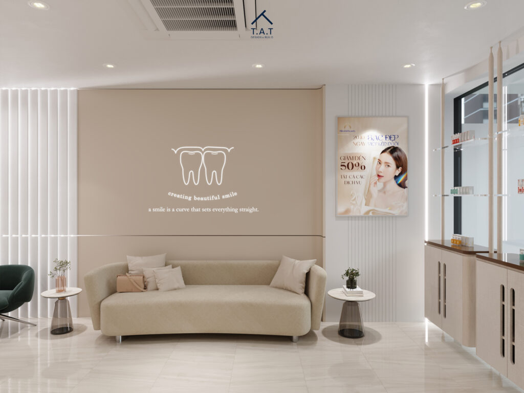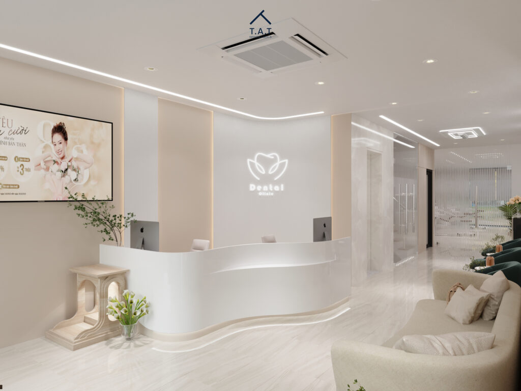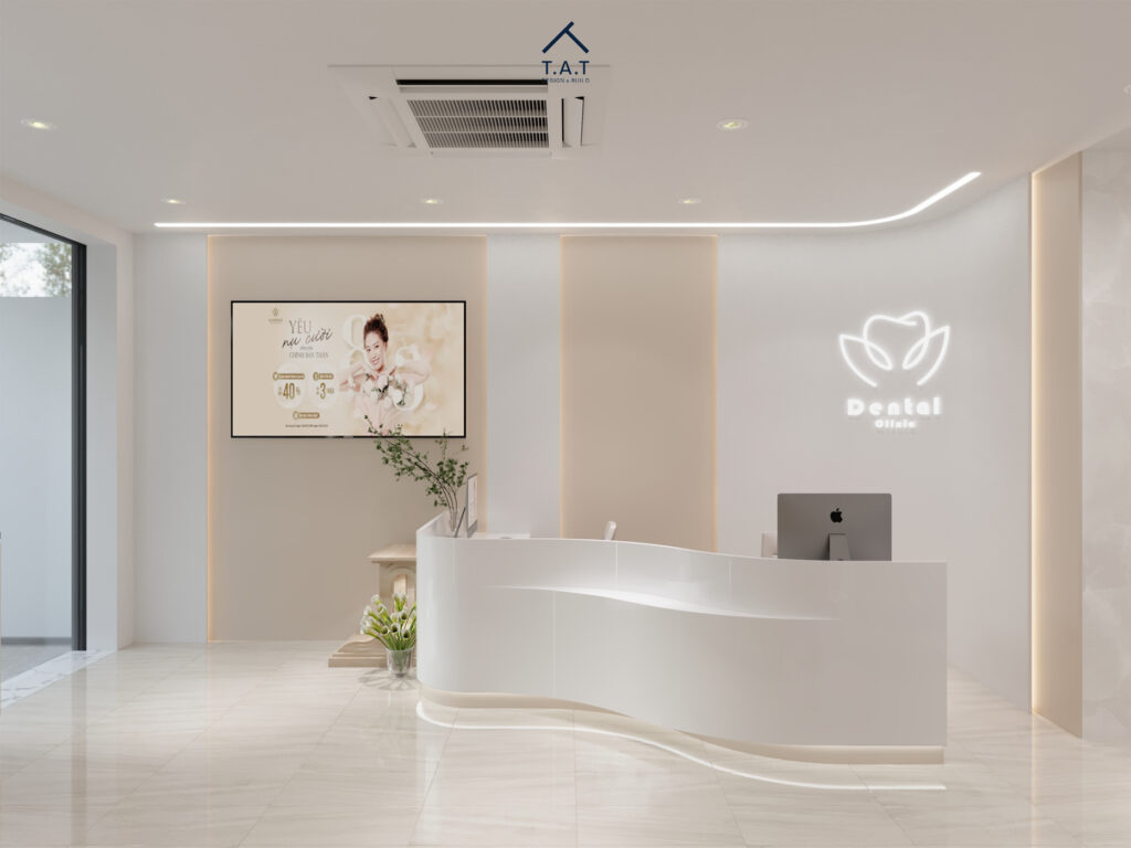 Bước vào sảnh chính, không gian mở ra với bảng màu be – trắng thanh lịch, quầy lễ tân bo cong mềm mại trở thành điểm nhấn trung tâm ngay khi bước vào. Ánh sáng LED âm trần chạy viền theo các đường cong tạo cảm giác liền mạch, dẫn lối thị giác sâu vào bên trong phòng khám.