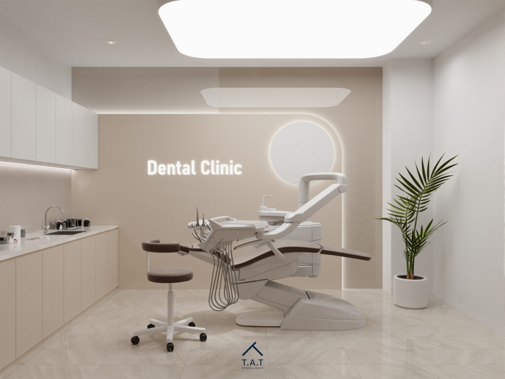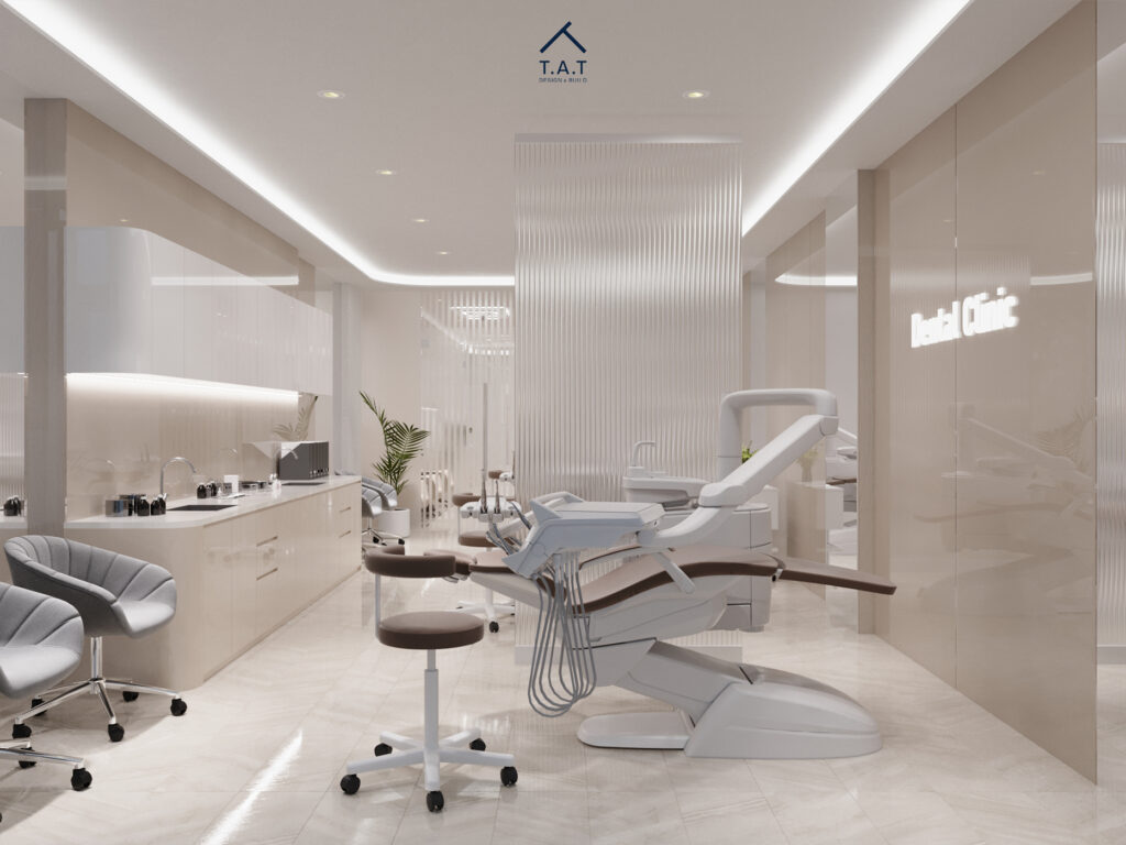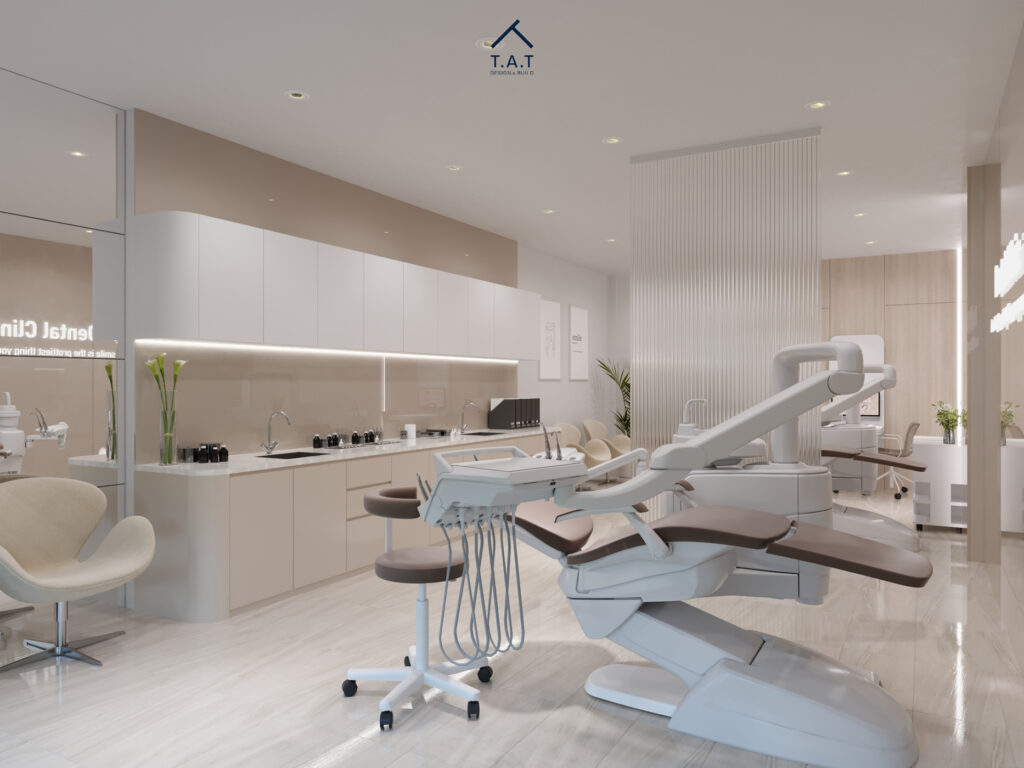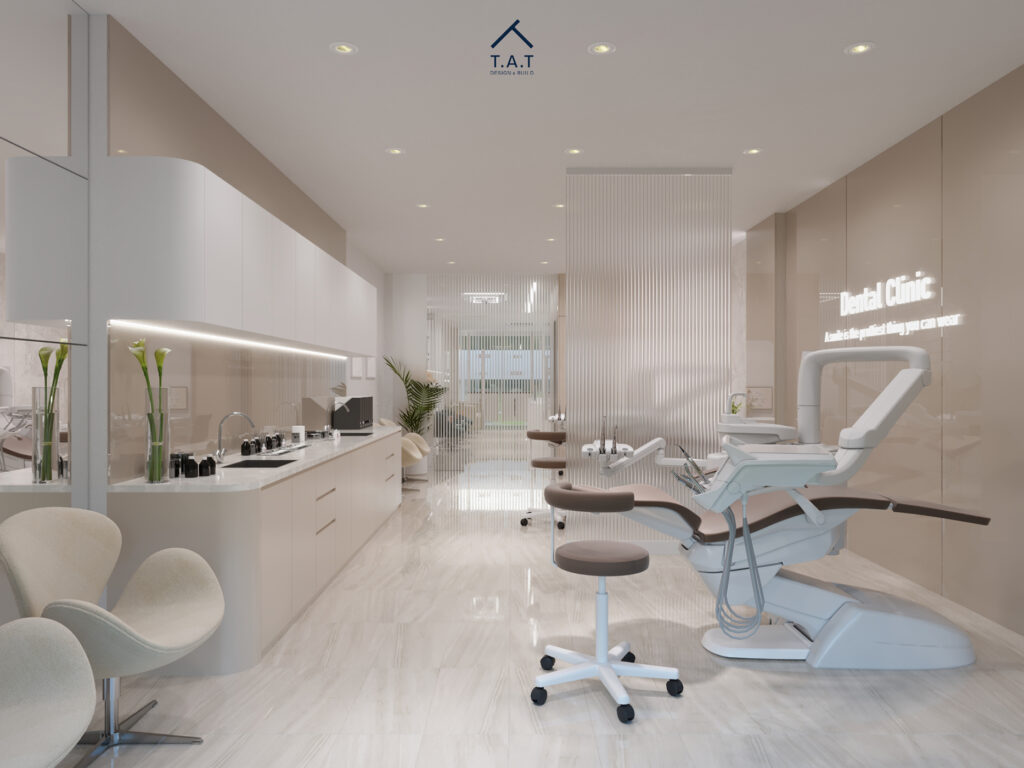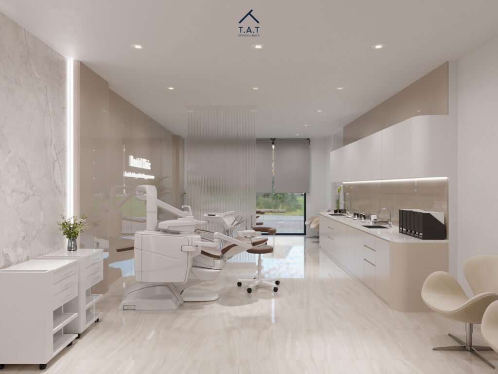 Không gian khám mở ra với bố cục mở, ghế điều trị đặt theo trục dọc, song song với hệ tủ lavabo chạy dài phía sau. Tông be – trắng tiếp tục được duy trì từ sảnh, kết hợp mặt đá bóng và tủ phẳng tối giản tạo cảm giác sạch và cao cấp.
