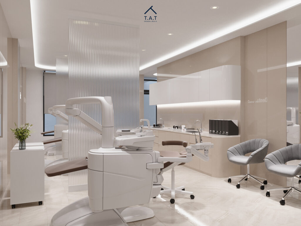 Từ góc nhìn ngược lại, các ghế điều trị được sắp xếp liên tiếp, tạo nhịp điệu không gian rõ ràng và chuyên nghiệp. Mảng tường kính màu be bóng phản chiếu ánh sáng và logo, tăng chiều sâu cho toàn bộ phòng khám.