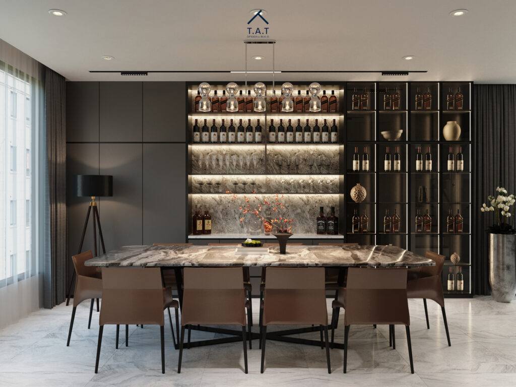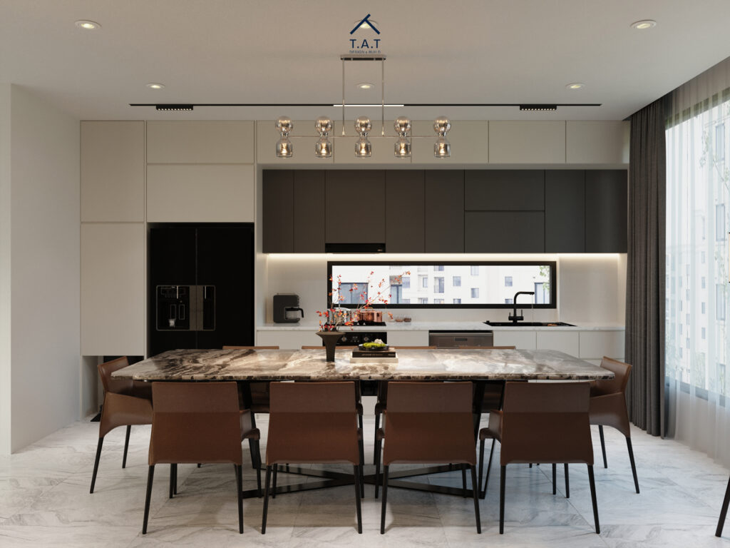 Liền mạch với phòng khách là khu bếp và bàn ăn được bố trí theo trục thẳng, tạo chiều sâu cho toàn bộ tầng ở. Bàn ăn mặt đá vân mây lớn kết hợp ghế da nâu mang lại cảm giác sang trọng, trong khi hệ tủ bếp trắng – xám tối giản giúp không gian gọn gàng và tinh tế.