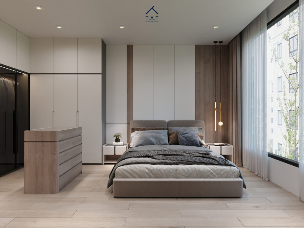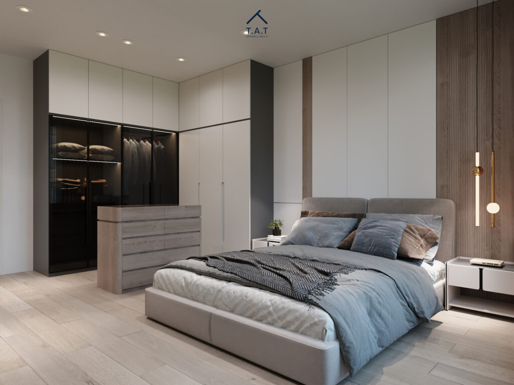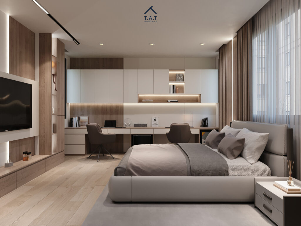 Phòng ngủ được bố trí theo trục ngang kéo dài, với giường bọc da xám đặt trung tâm và hệ bàn làm việc – tủ treo chạy liền mạch phía sau. Sự kết hợp giữa gỗ veneer ấm và cánh tủ trắng phẳng tạo nên nhịp điệu hiện đại, gọn gàng.