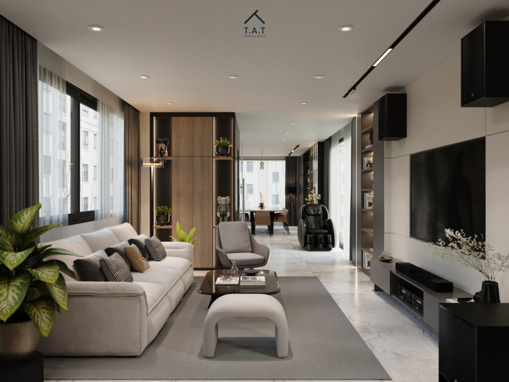 Khi nhìn dọc theo trục căn hộ, sự liên thông giữa phòng khách – khu chuyển tiếp – bàn ăn tạo nên cảm giác rộng rãi và mạch lạc. Hệ tủ gỗ cao kịch trần cùng đèn LED âm giúp nhấn chiều cao không gian, trong khi sàn đá sáng màu phản chiếu ánh sáng, làm tổng thể thêm thoáng đãng.