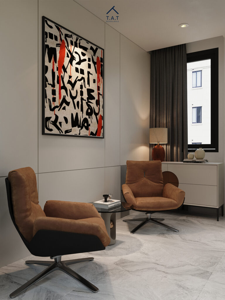 Ngoài ra, còn có hiện diện một góc nhỏ với hai ghế lounge da nâu bố trí đối diện nhau tạo nên không gian trò chuyện thân mật, tách nhẹ khỏi khu sinh hoạt chung nhưng vẫn trong cùng một mặt bằng mở.