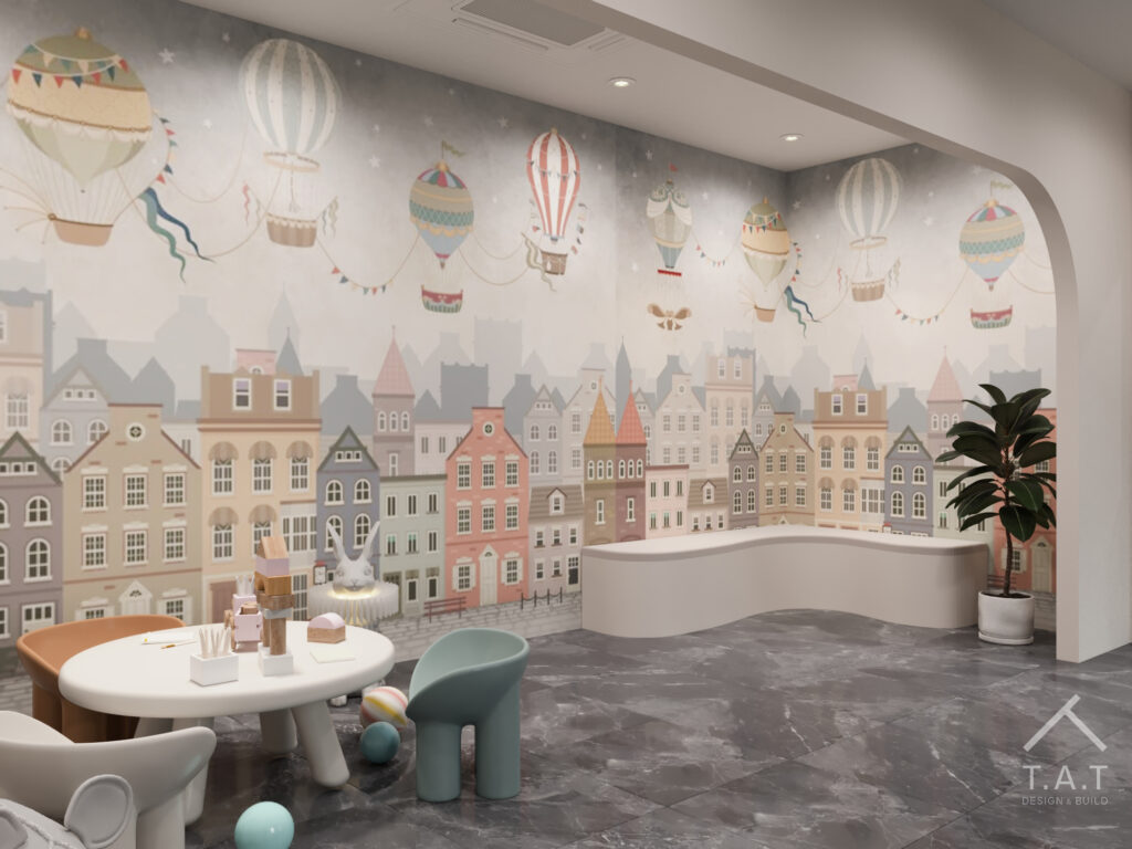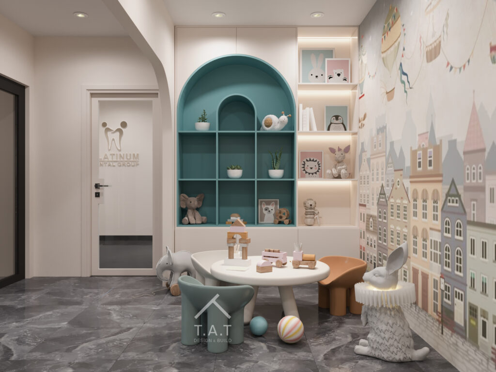 Khu vui chơi trẻ em tại tầng 2 được thiết kế như một góc nhỏ riêng biệt nhưng vẫn kết nối hài hòa với tổng thể nha khoa. Mảng tường minh họa đầy đủ màu sắc cũng như hình ảnh dễ thương giúp các bé vui chơi hoặc giảm bớt căng thẳng nếu chuẩn bị vào khám.