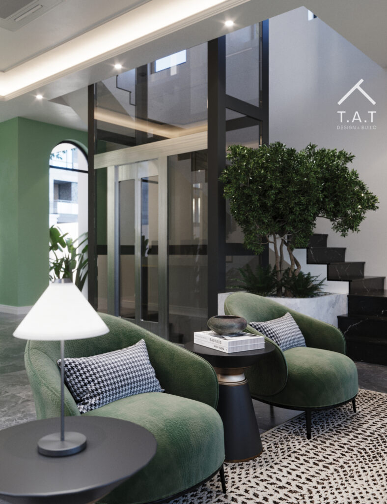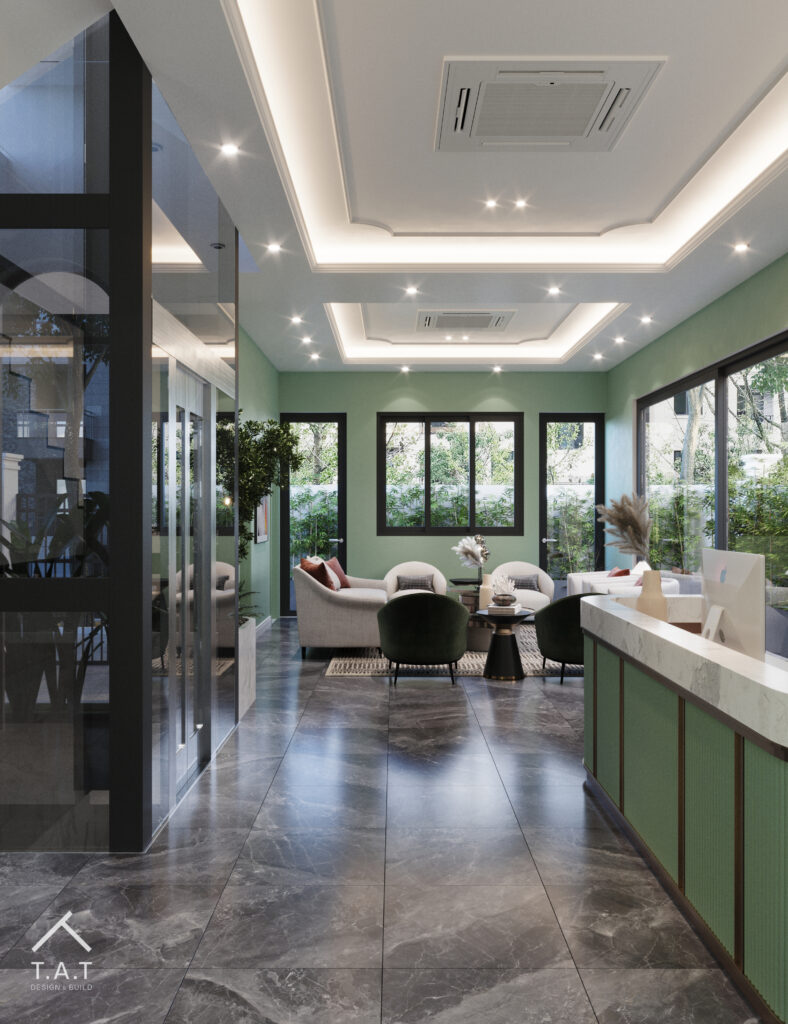 Không gian sảnh chờ được tổ chức theo bố cục mở, các khu ngồi bố trí linh hoạt để tạo sự thông thoáng và riêng tư vừa đủ cho từng nhóm khách. Tông xanh kết hợp vật liệu đá và kim loại mang lại cảm giác hiện đại nhưng không lạnh, cách bố trí mang lại cảm giác gần gũi như ở nhà, làm tăng sự gần gũi hơn với khách hàng.