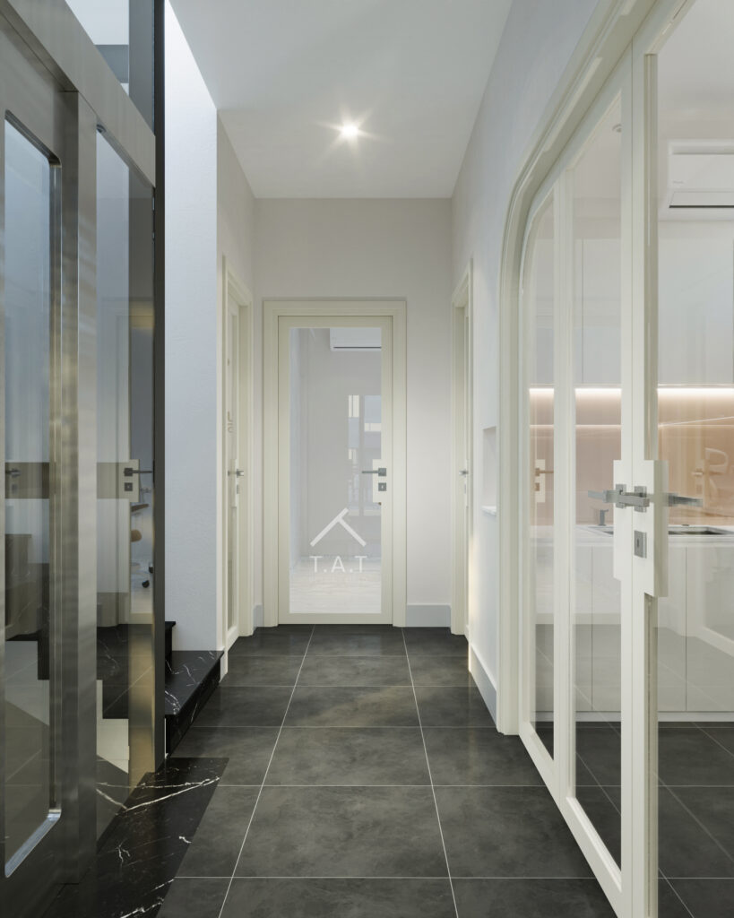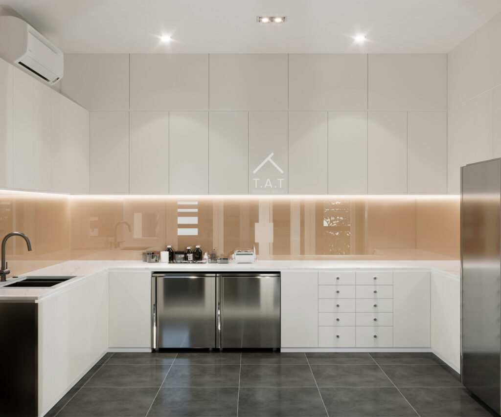 Không gian khám tầng 2 được thiết kế theo tinh thần tối giản, tập trung vào sự gọn gàng và cảm giác an tâm cho bệnh nhân. Tông màu trắng – be chủ đạo kết hợp cùng ánh sáng gián tiếp dưới hệ tủ tạo nên bầu không khí nhẹ nhàng, sạch sẽ và chuyên nghiệp.