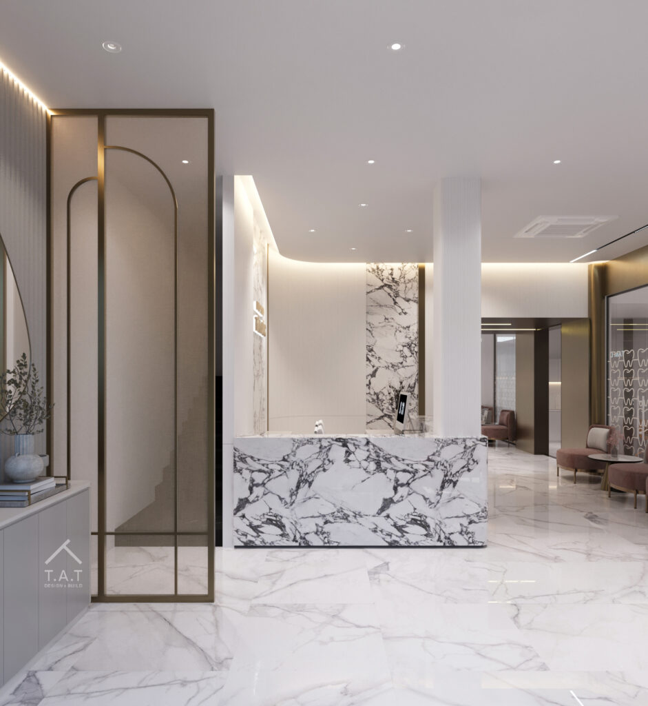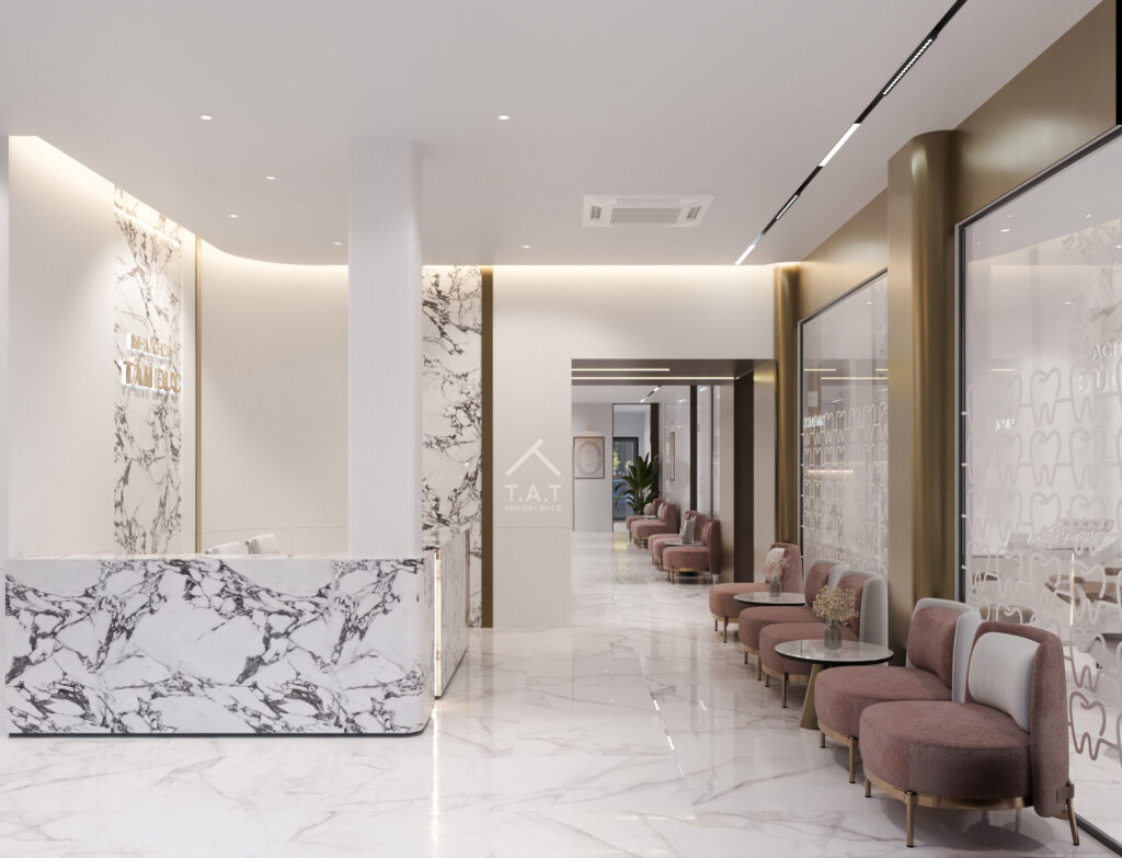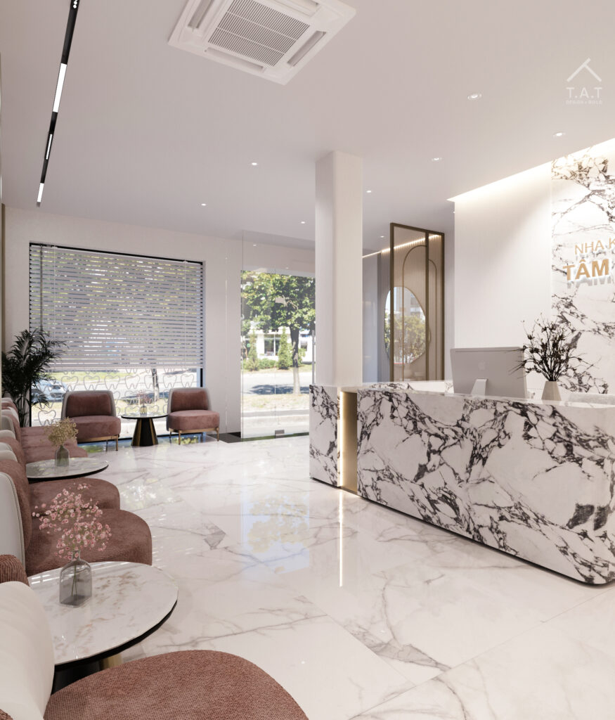 Không gian chờ và lễ tân mang phong cách hiện đại tối giản, nổi bật với quầy lễ tân ốp đá marble vân mây sang trọng kết hợp sàn đá bóng tạo cảm giác rộng và phản chiếu ánh sáng tốt. Trần thạch cao phẳng tích hợp hệ đèn downlight âm trần và khe đèn hắt gián tiếp, giúp tổng thể mềm mại và tinh tế.