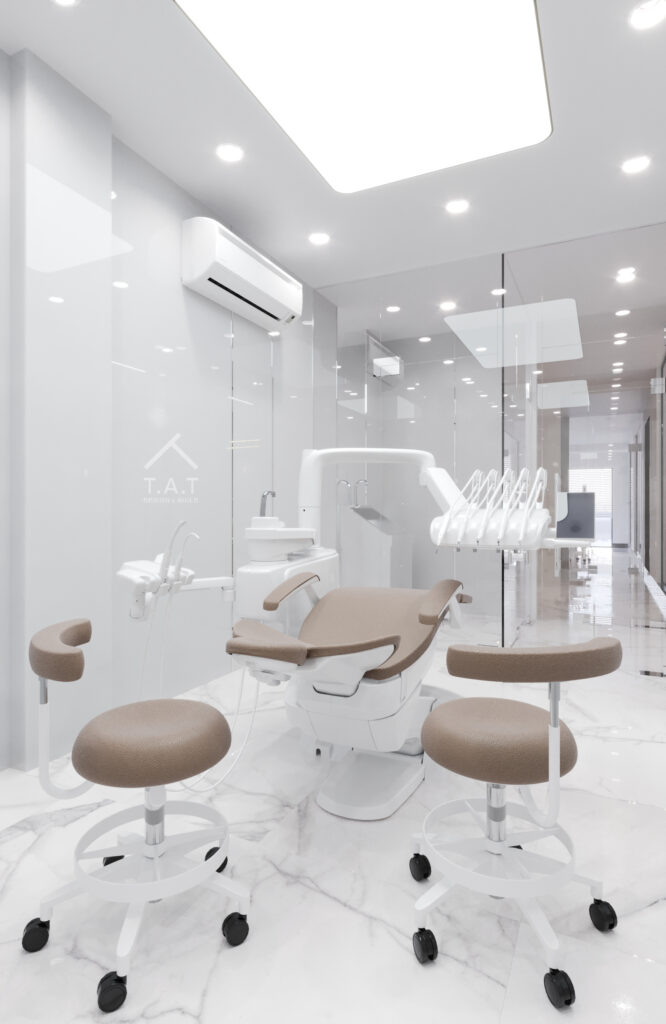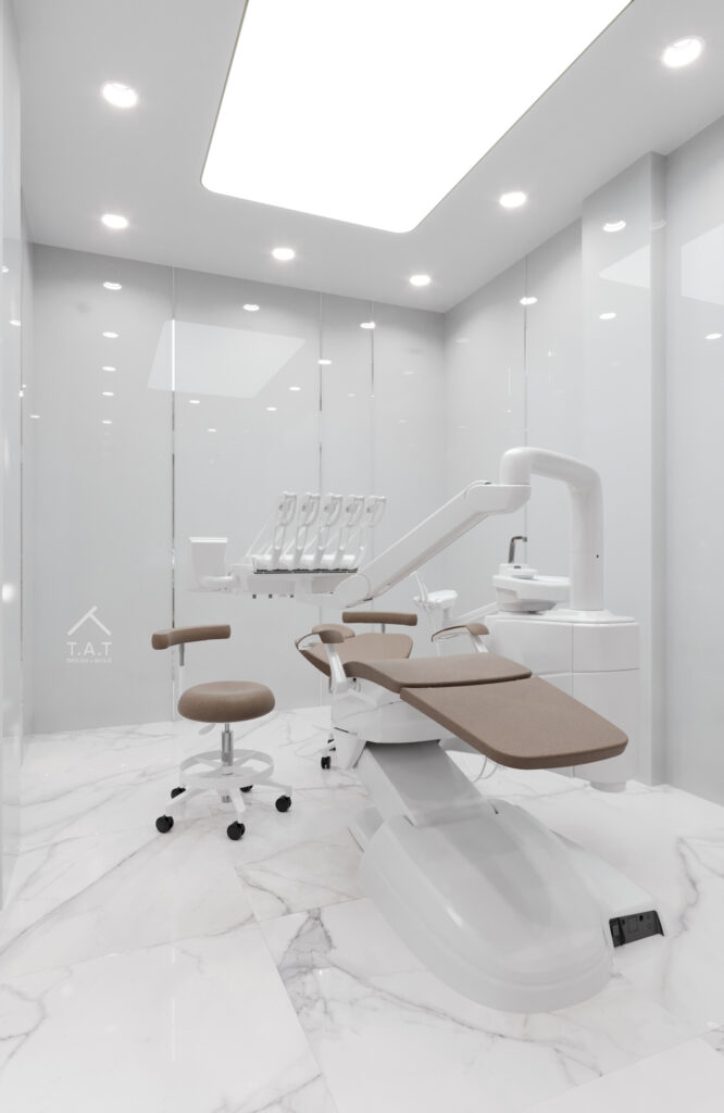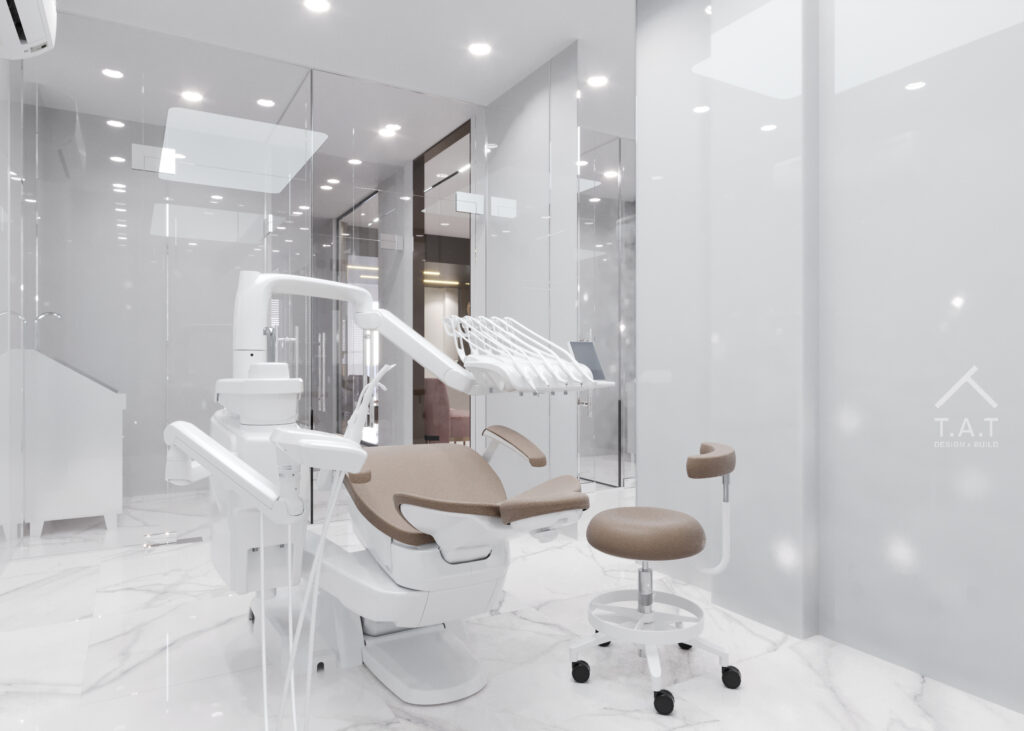 Phòng implant được thiết kế theo tinh thần tối giản – vô trùng, với bảng màu trắng chủ đạo nhằm tăng cảm giác sạch sẽ và kiểm soát thị giác.
