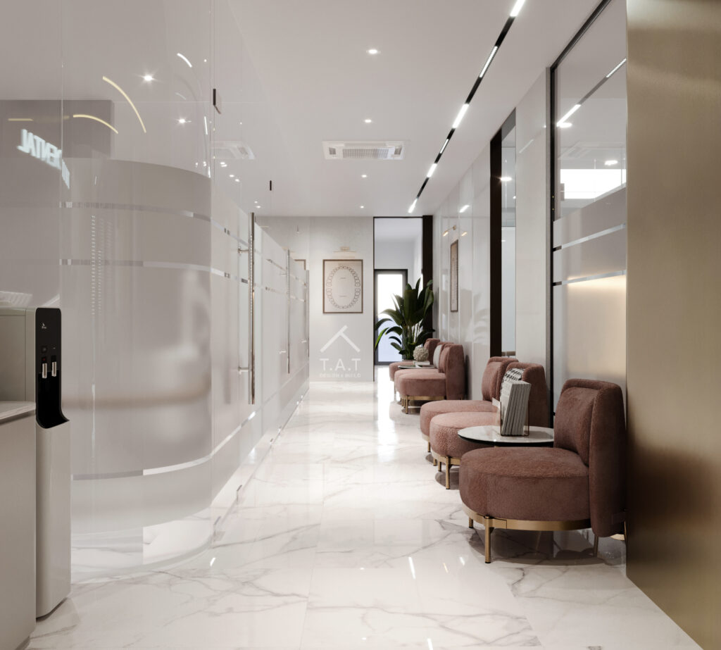 Dãy ghế chờ bọc nỉ tông hồng đất phối chân kim loại mảnh tạo điểm nhấn ấm áp trên nền màu trung tính. Hơn nữa, các mảng tường ốp kim loại ánh vàng và kính lớn tăng chiều sâu thị giác, mang lại cảm giác cao cấp và chuyên nghiệp cho không gian.