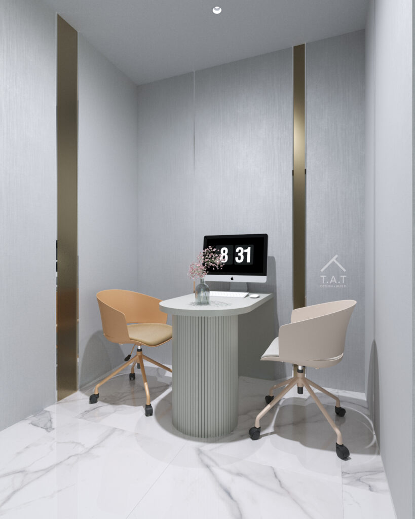 Không gian được mở ra với các vách kính ở những nơi hợp lý, thêm vào đó, việc làm mờ các phần kính tạo cảm giác riêng tư, chuyên biệt mà vẫn có yếu tố thoải mái cho cả khách hàng và bác sĩ trong việc khám và điều trị.