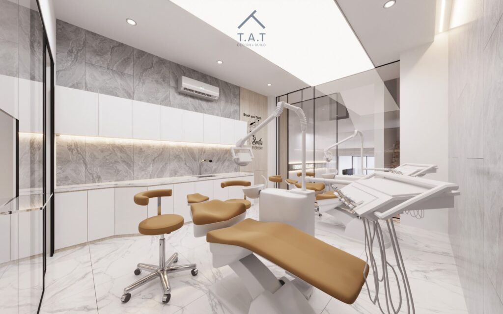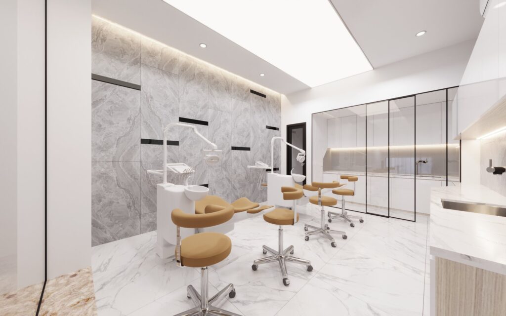 Tổng kết: Không gian này đạt được sự cân bằng giữa thẩm mỹ cao cấp và tiêu chuẩn y tế. Tông màu vàng của ghế là một điểm nhấn thị giác rất tốt trên nền trắng – xám chủ đạo.