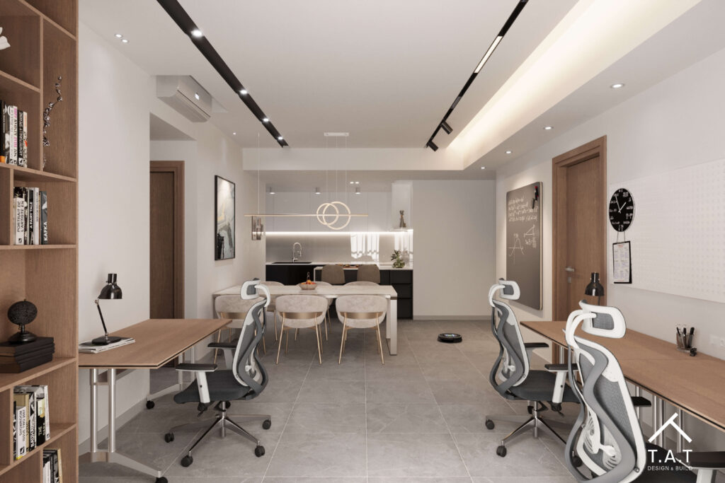 Căn phòng được thiết kế theo dạng không gian mở (open plan), kết nối liên hoàn giữa khu vực làm việc và khu vực ăn uống/bếp. Điều này giúp tối ưu hóa diện tích và tạo sự thông thoáng về tầm nhìn.