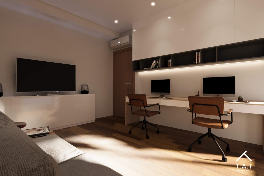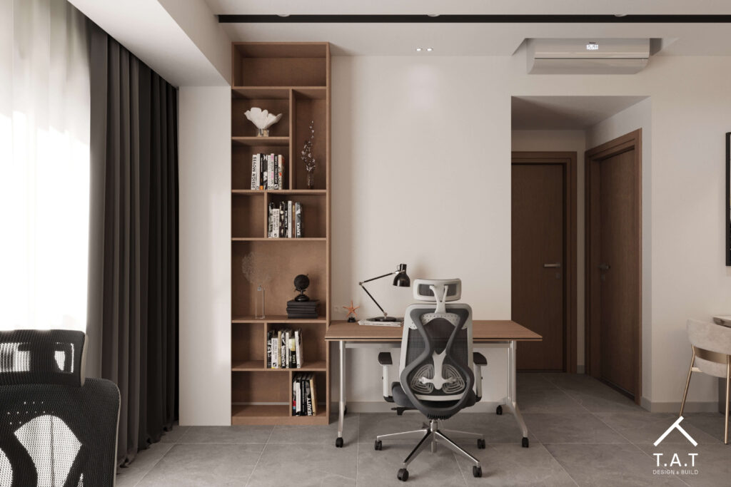 Căn phòng này là một ví dụ tuyệt vời về thiết kế tích hợp. Nó không chỉ đáp ứng nhu cầu ngủ nghỉ mà còn tạo ra một môi trường làm việc chuyên nghiệp và góc giải trí riêng tư. Cách sử dụng vật liệu gỗ lát sàn đồng nhất gắn kết mọi khu vực chức năng lại thành một tổng thể hài hòa.