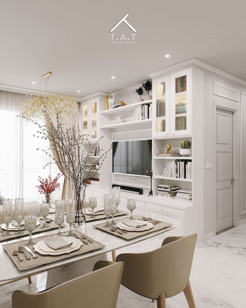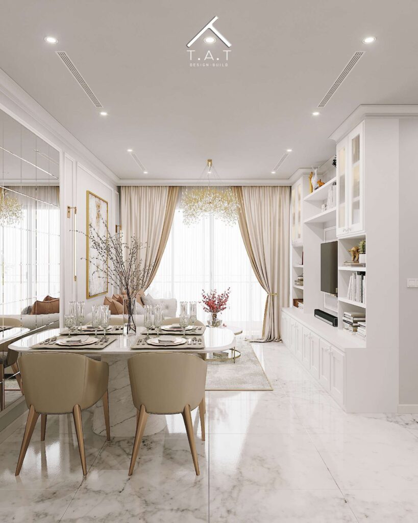 Chủ đạo là tông Trắng – Ghi sáng (Grey) – Kem, tạo cảm giác thanh lịch và nới rộng diện tích. Các sắc độ trung tính này làm nền cho những điểm nhấn mạnh mẽ hơn từ màu xanh Navy của ghế bar và mặt đá đen vân mây của bàn ăn.