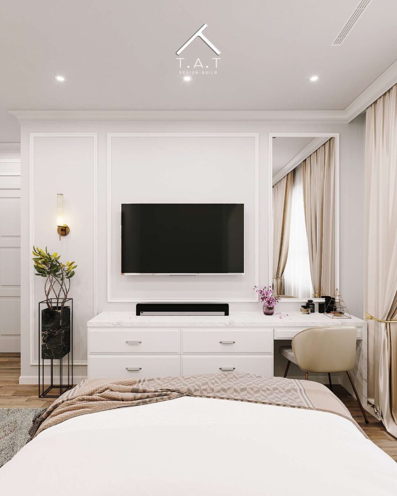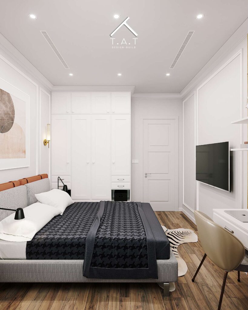 Tiếp nối ngôn ngữ thiết kế của không gian khách – bếp, phòng ngủ là một bản giao hưởng nhẹ nhàng, ấm cúng nhưng vẫn giữ trọn nét tinh tế của phong cách tân cổ điển hiện đại của không gian phòng ngủ.