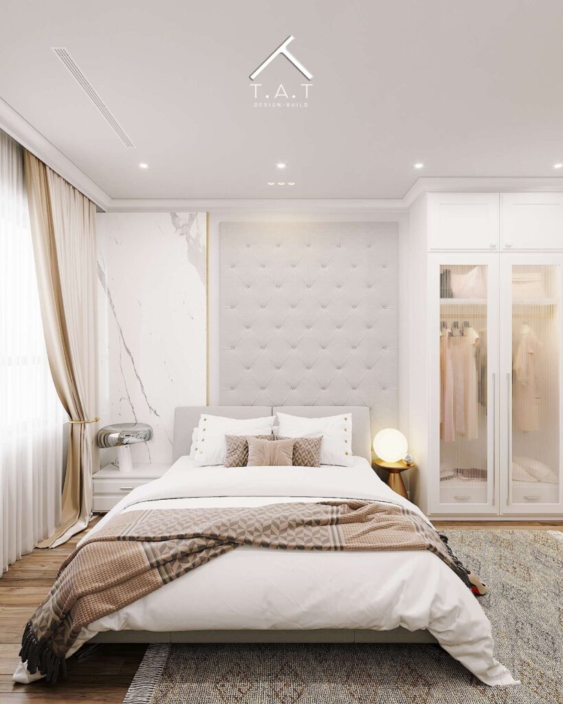 Điểm nhấn đắt giá nhất nằm ở mảng tường đầu giường. Sự kết hợp giữa vách ốp da quả trám (tufted headboard) cao kịch trần và mảng đá marble trắng vân mây thanh khiết bên cạnh tạo nên một diện mạo đầy quyền quý và kiêu sa.