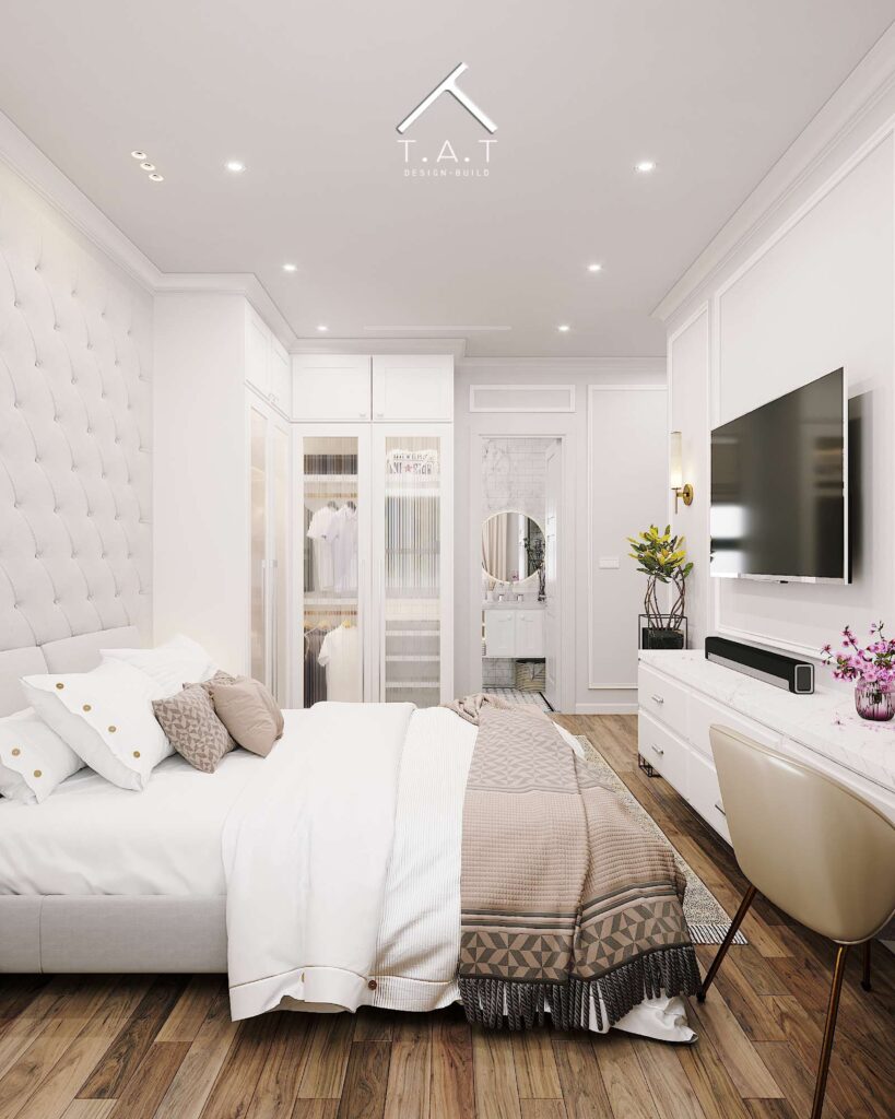 Căn phòng tràn ngập tông màu trắng kem – beige, tạo nên một bầu không khí thư giãn và tinh khôi. Sàn gỗ màu trung tính giúp cân bằng lại sắc trắng, mang đến cảm giác ấm áp, vững chãi.