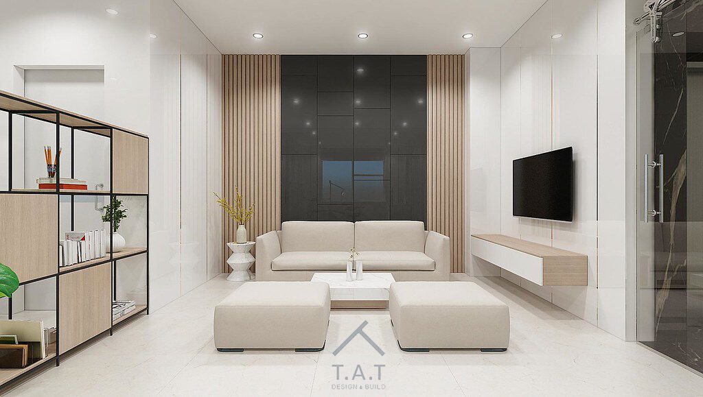 Khu vực tiếp khách & Chờ: Được bố trí bộ sofa màu kem trang nhã, bàn trà mặt đá và kệ sách trang trí. Mảng tường phía sau sofa sử dụng ốp vách kính đen bóng kết hợp nan gỗ dọc, tạo chiều sâu và điểm nhấn sang trọng.
