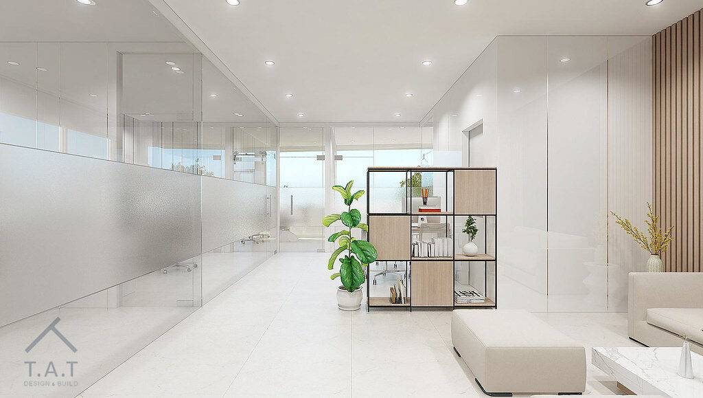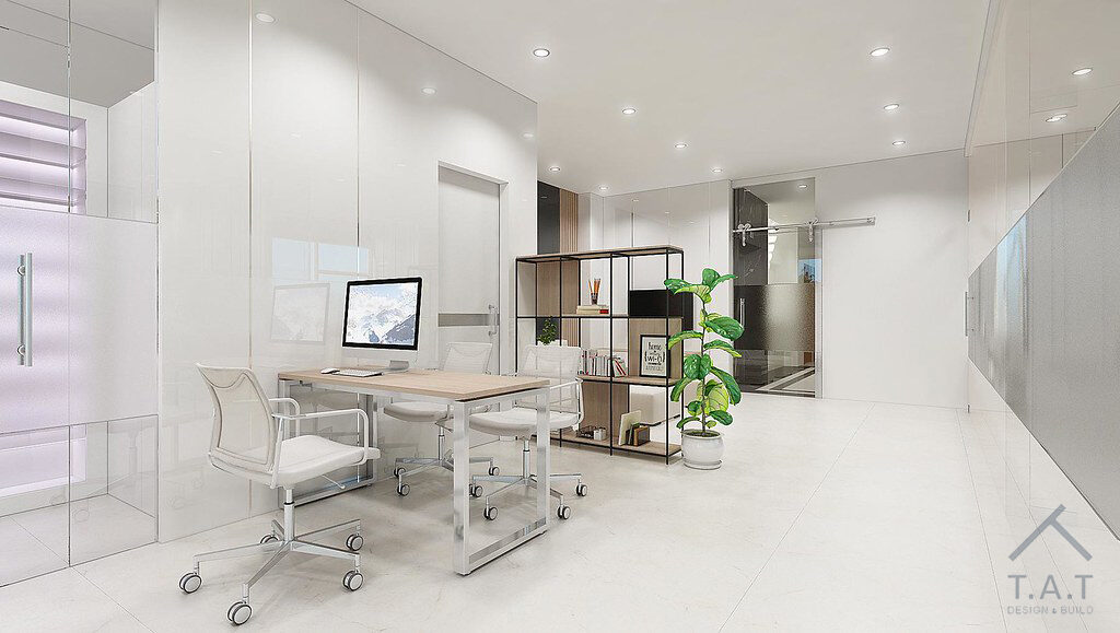 Việc kết hợp với vật liệu gỗ sáng màu và kính mờ. Sự kết hợp này không chỉ giúp mở rộng không gian về mặt thị giác mà còn tạo ra môi trường vô trùng, hiện đại nhưng không quá lạnh lẽo nhờ các điểm nhấn từ gỗ và cây xanh.