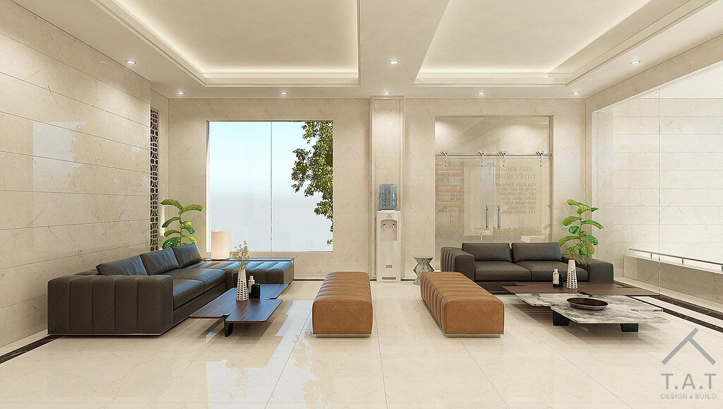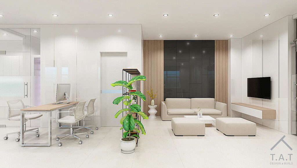 Khu vực sảnh đón (Reception): Được thiết kế mở, tạo ấn tượng đầu tiên về sự sạch sẽ và chỉn chu. Quầy lễ tân sử dụng khối phẳng phối màu trung tính, tạo sự chuyên nghiệp ngay từ khi bước vào.