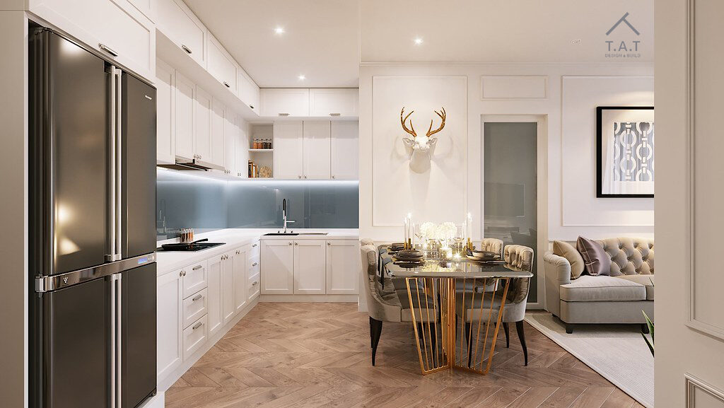 Sự kết nối mở giữa bếp và phòng ăn giúp không gian trở nên thông thoáng, cực kỳ phù hợp cho những căn hộ hiện đại.