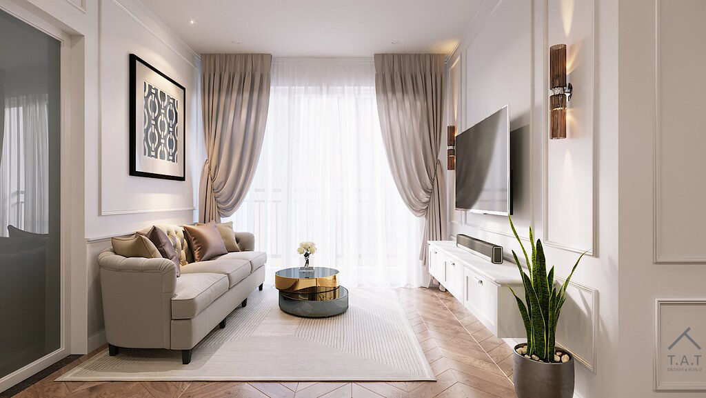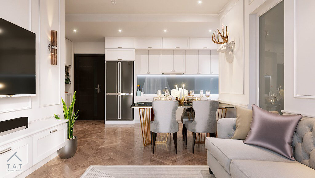 Không gian căn hộ Cát Linh là một bản giao hưởng nhẹ nhàng của phong cách Neo-Classic (Tân cổ điển) pha trộn với nét hiện đại, tối giản, tạo nên cảm giác sang trọng nhưng vẫn rất gần gũi và ấm cúng.