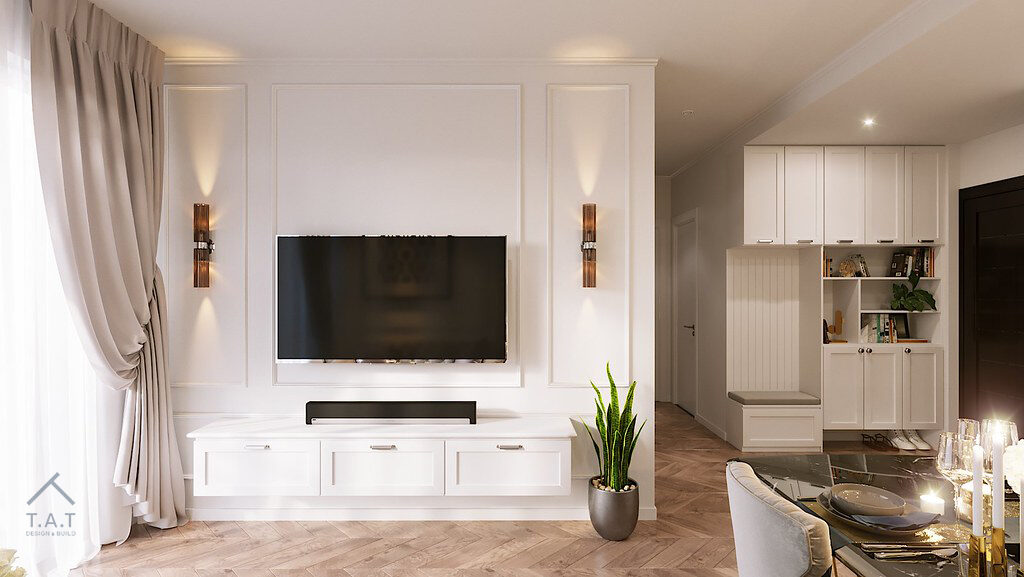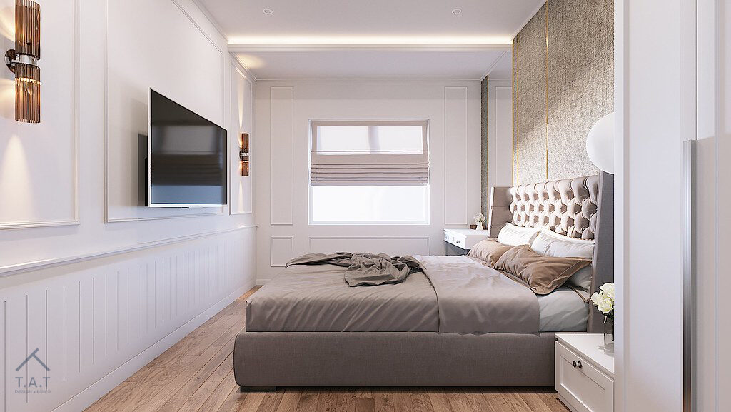 Điểm ấn tượng đầu tiên chính là hệ tường được trang trí bằng các đường phào chỉ (molding) thanh mảnh, đặc trưng của tinh thần cổ điển nhưng được lược bỏ những chi tiết cầu kỳ để giữ lại sự thanh thoát.