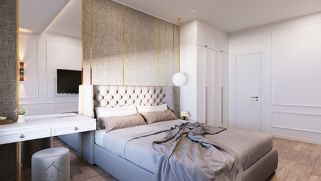 Căn phòng tràn ngập những tông màu nhã nhặn như trắng kem, xám nhạt và be. Những sắc thái này không chỉ giúp không gian trông rộng rãi hơn mà còn tạo ra một hiệu ứng thị giác cực kỳ dễ chịu, giúp tâm trí nhanh chóng đi vào trạng thái nghỉ ngơi.