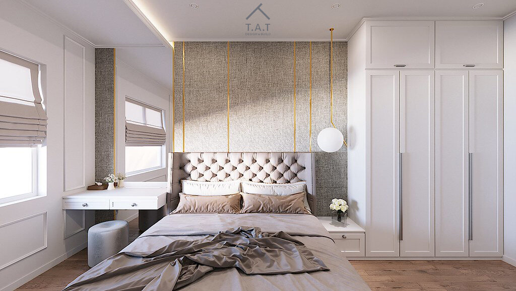 Thiết kế là sự kết hợp ngọt ngào giữa nét sang trọng của phong cách Tân cổ điển nhẹ nhàng và sự ấm áp của chất liệu hiện đại.