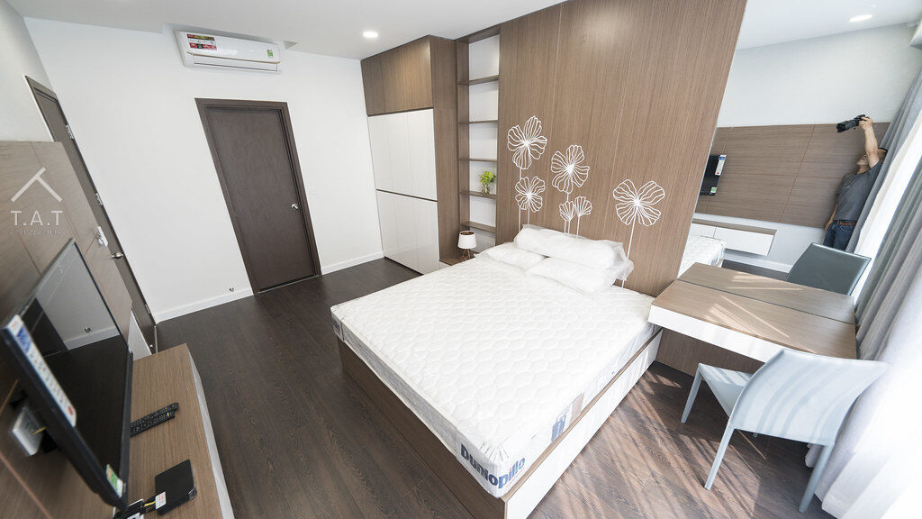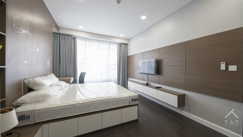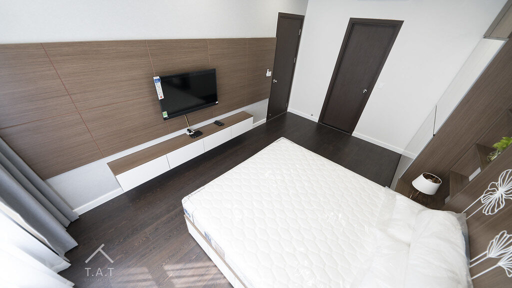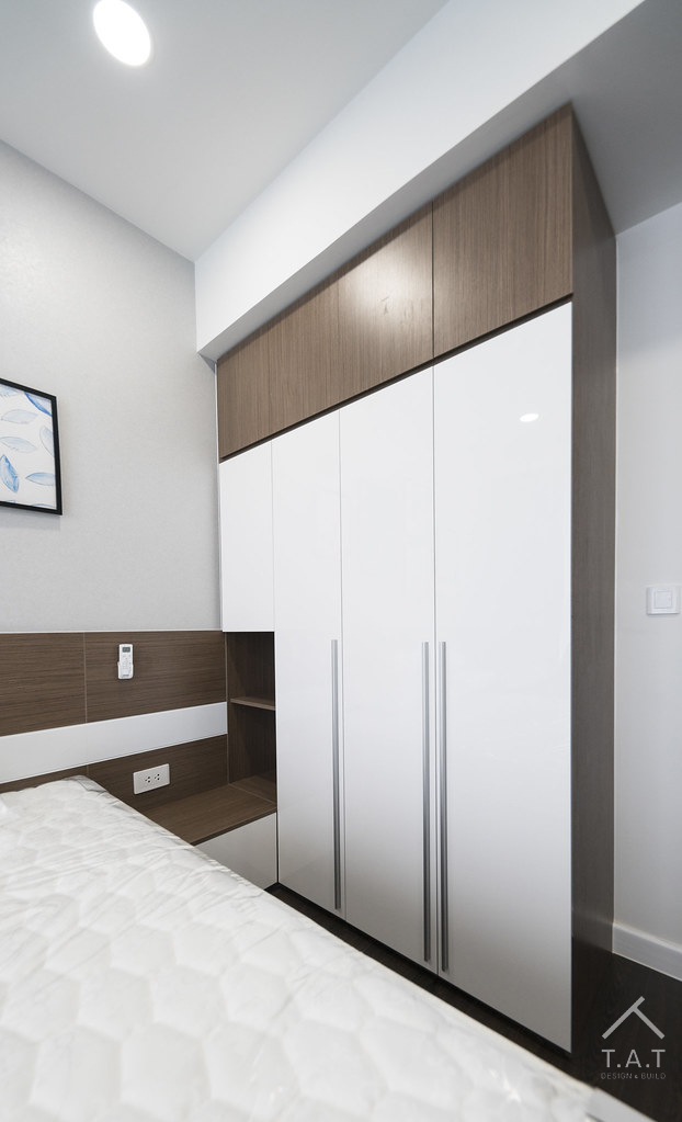 Tất cả các chi tiết nội thất, từ kệ trang trí mở cho đến hệ tủ tivi đối diện giường, đều được tính toán tỉ mỉ để tối ưu hóa công năng mà không gây cảm giác chật chội.