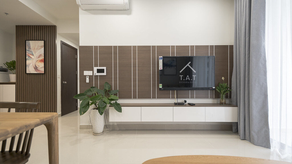 Mảng tường phía sau tivi không quá cầu kỳ nhưng lại đầy ấn tượng với các đường kẻ chỉ thanh mảnh trên nền gỗ, tạo nên chiều sâu cho không gian. Đối diện đó, khu vực bếp được chăm chút tỉ mỉ với hệ tủ phẳng, gọn gàng.