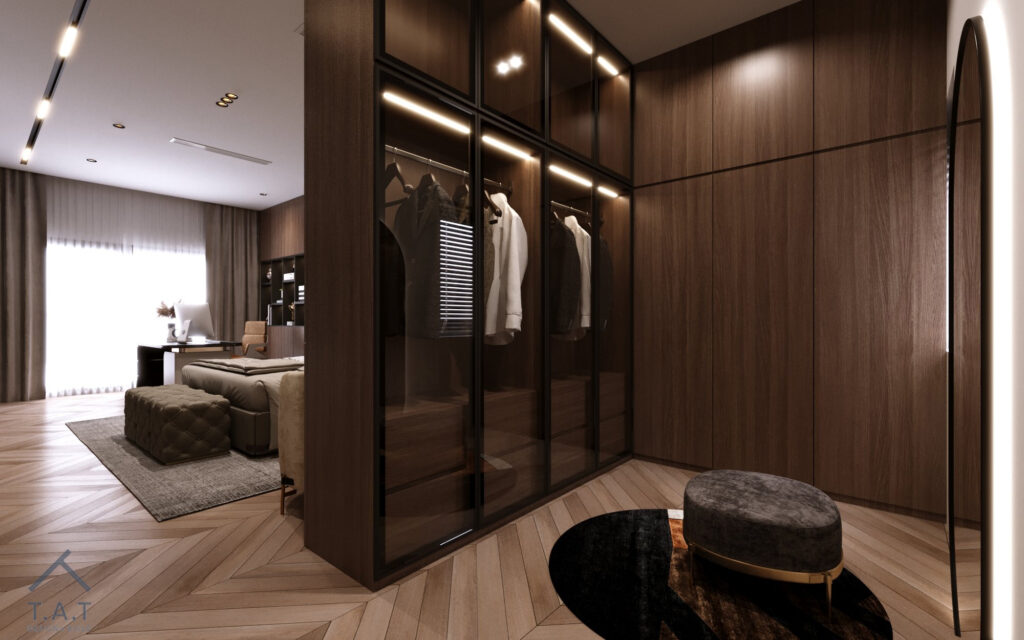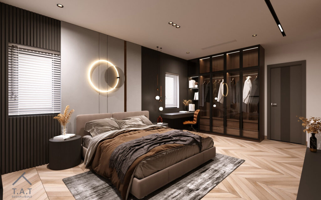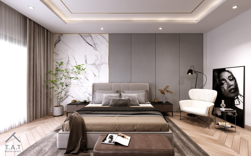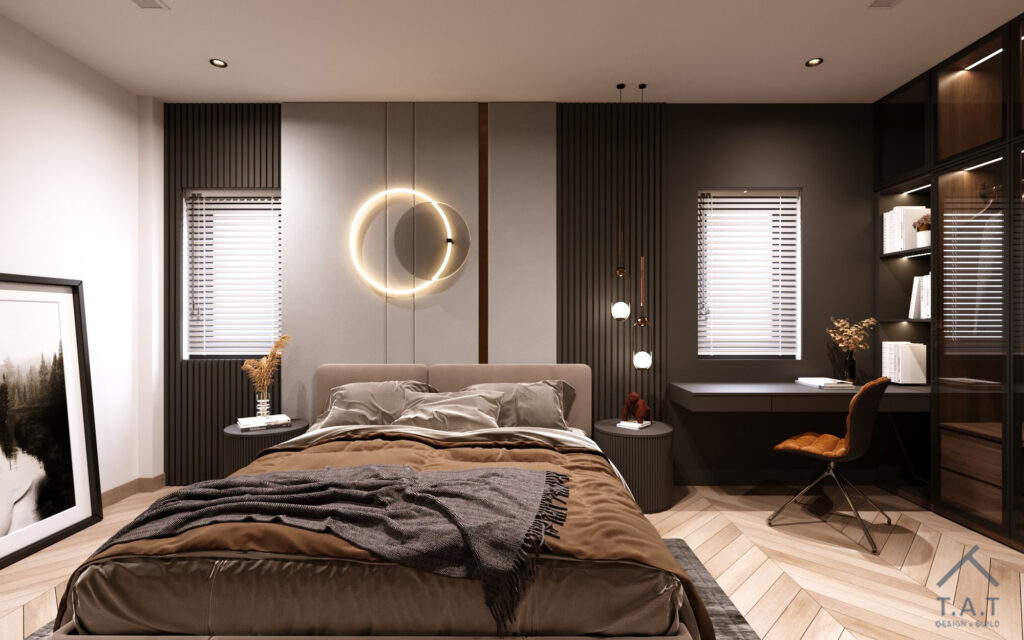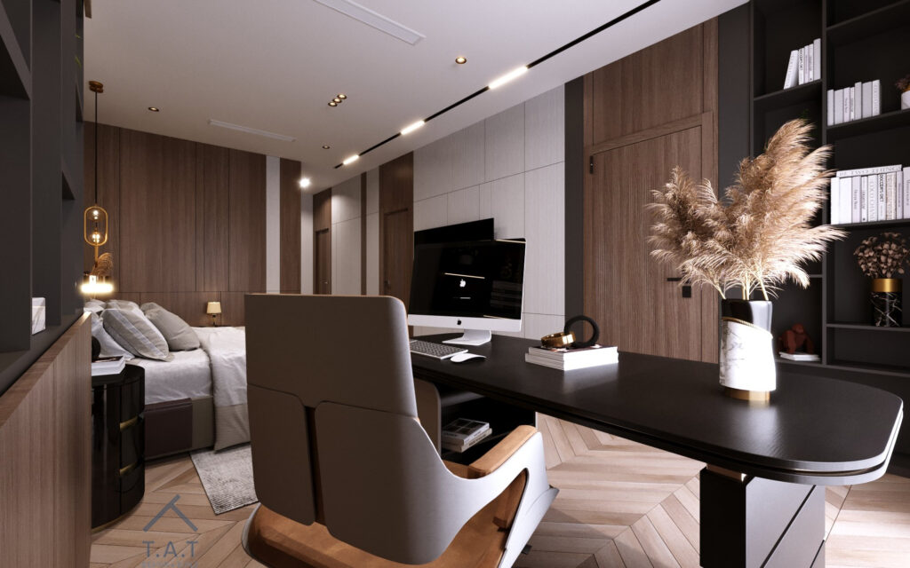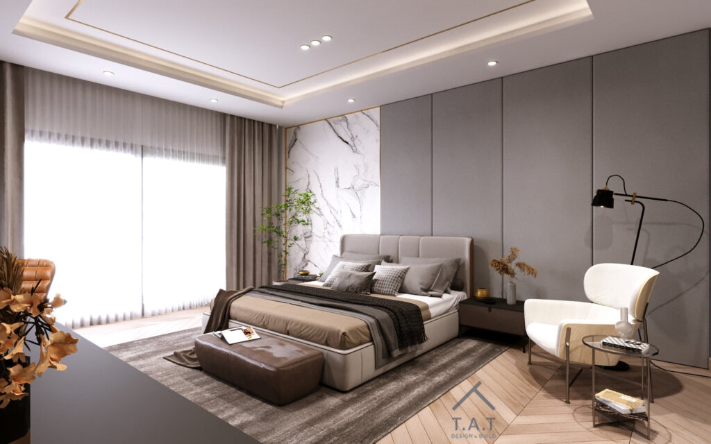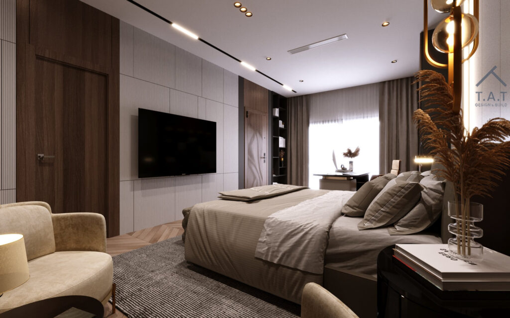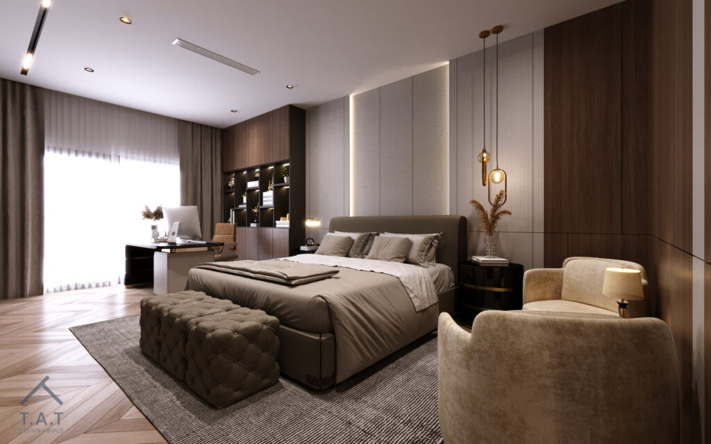 Đến với không gian ngủ cuối cùng, một sự kết hợp hoàn hảo giữa phòng nghỉ ngơi, góc làm việc chuyên nghiệp và khu vực thư giãn cá nhân, mang phong cách contemporary luxury với cách xử lý mảng khối và ánh sáng rất tinh tế.