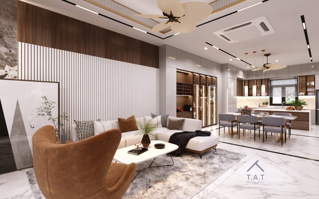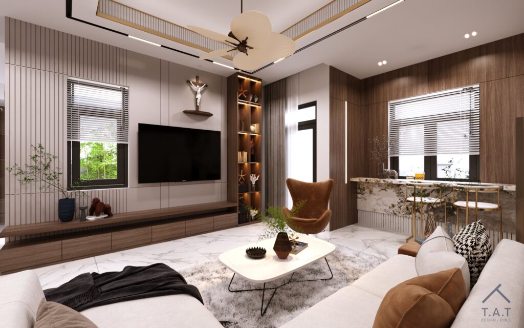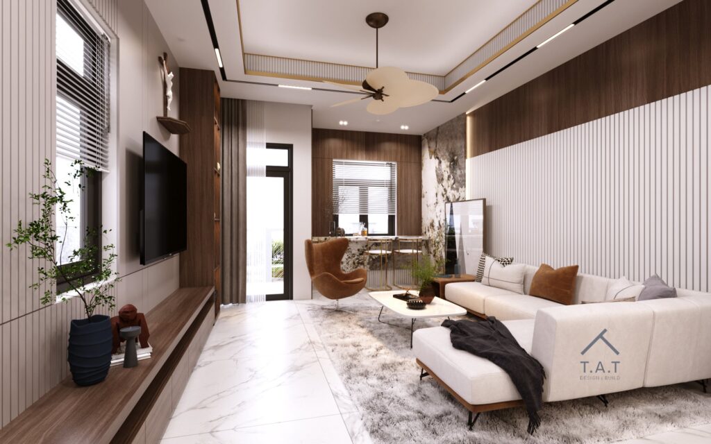 - Màu gỗ trầm: Các diện tường gỗ được sử dụng để “khóa” các mảng không gian, tạo sự vững chãi và sang trọng.