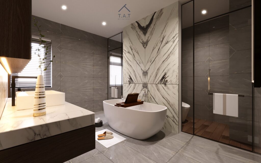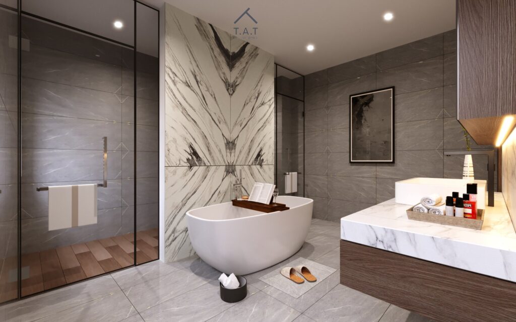 Sự mạnh mẽ và độc đáo đến từ việc sử dụng các loại vật liệu khác nhau nhưng lại hợp (match) nhau 1 cách nhịp nhàng từ tường được ốp đá marble vân đối xứng đến hệ sàn porcelain hoặc đá granite khổ lớn đi kèm với sàn gỗ nhựa composite (WPC) tạo nên sự chuyển tiếp không gian chức năng 1 cách tự nhiên.