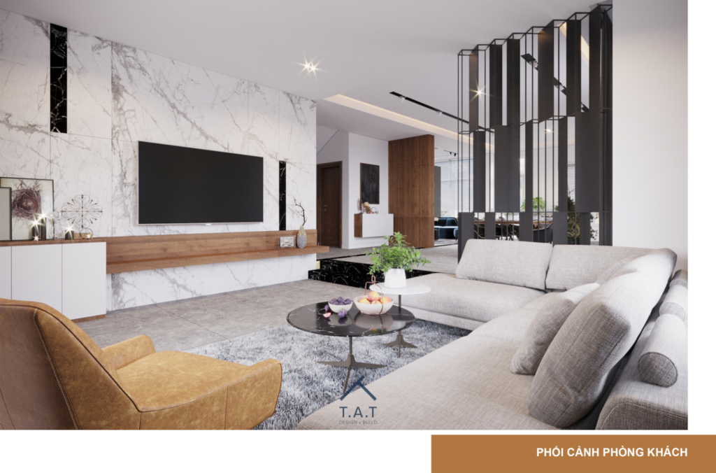 Phòng khách gây ấn tượng bởi sự phối hợp nhịp nhàng giữa các mảng màu trung tính và vật liệu cao cấp: gỗ, đá marble,…