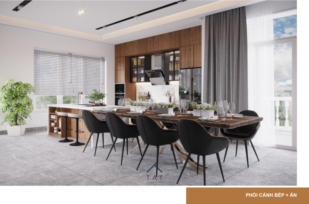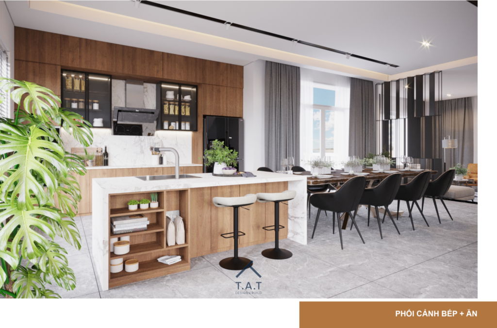 Di chuyển lên cao hơn một bậc (split-level), khu vực bếp và phòng ăn hiện ra với một phong cách rất “tây” và chuyên nghiệp. Nếu ở phòng khách là sự hào nhoáng, thì không gian bếp này thiên về sự tinh tế và trải nghiệm sử dụng.
