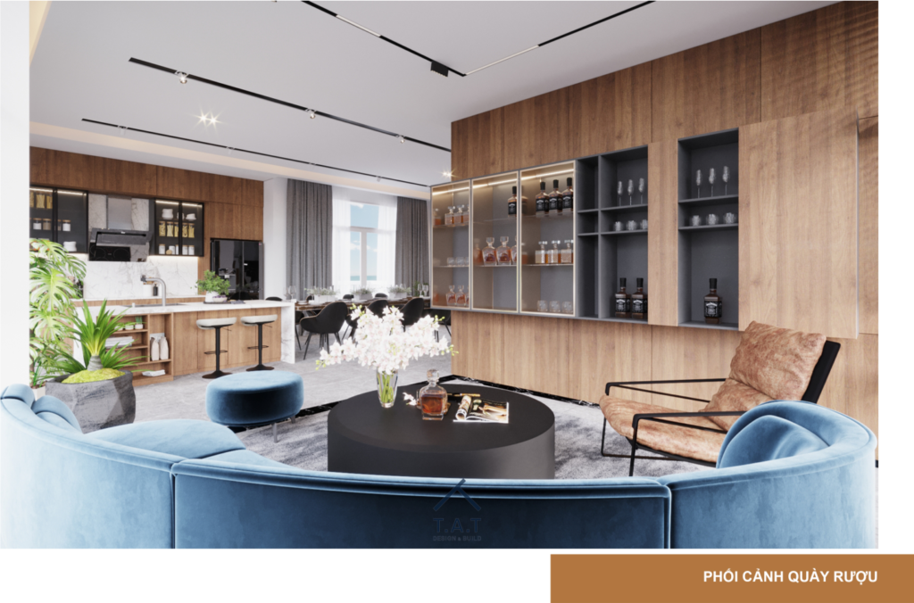 Điểm đắt giá nhất nằm ở bộ sofa cong màu xanh pastel/velvet blue, thổi vào không gian một luồng gió mới, làm dịu lại toàn bộ tông ấm của gỗ và đá marble ở các khu vực khác và tạo ra 1 điểm dừng thị giác cực kỳ dễ chịu, biến góc này thành một thực thể riêng biệt nhưng vẫn kết nối với tổng thể.