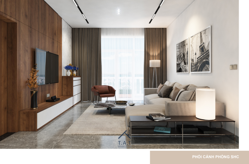 - Tông bổ trợ (30%): Nâu gỗ trầm và Đen mờ (matte). Những mảng gỗ ở tủ bếp, kệ TV và các thanh lam đen đóng vai trò “thắt nút” không gian, tạo độ sâu và sự vững chãi, nam tính.