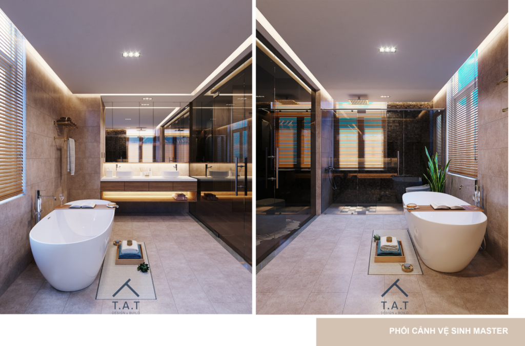 Sự kết hợp giữa màu nâu của gỗ, màu xám của đá và màu trắng sứ của bồn tắm tạo nên một bảng màu cực kỳ bền vững với thời gian (timeless), mang lại cảm giác bình yên và phục hồi năng lượng.