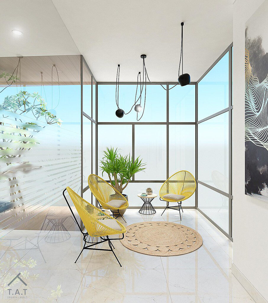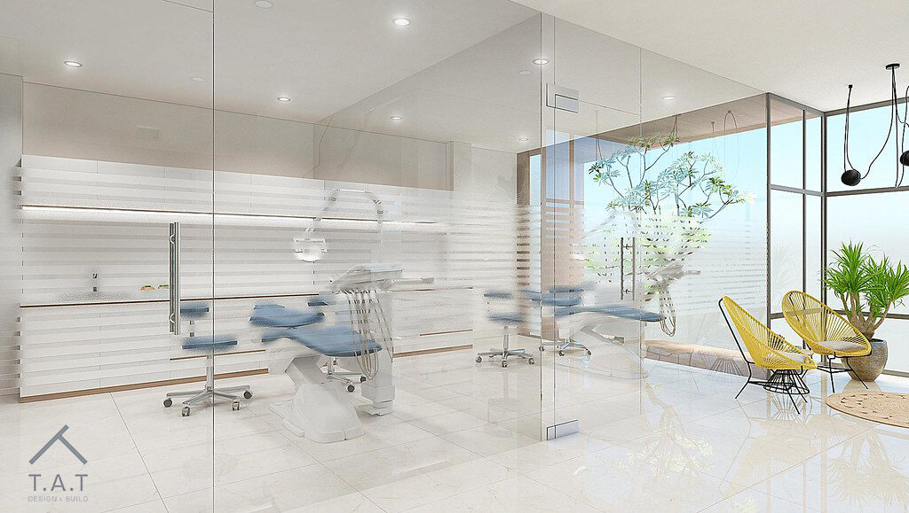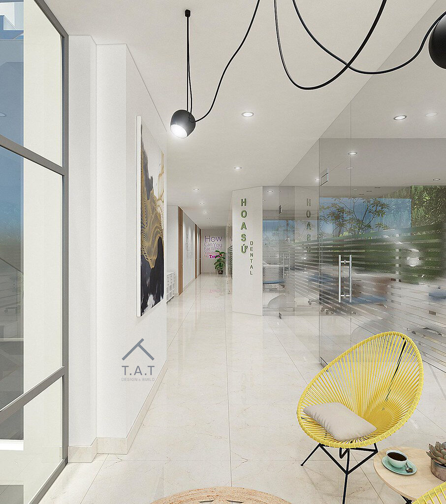 Kế bên đó, không gian khám và điều trị liền kề hiện lên trước mắt thông qua mảng kính kịch trần, vừa tạo sự thông thoáng liên kết cũng như tạo những đường kẻ mờ tăng phần riêng tư hơn cho không gian điều trị.