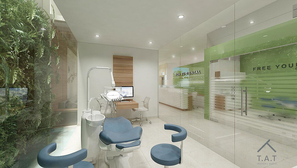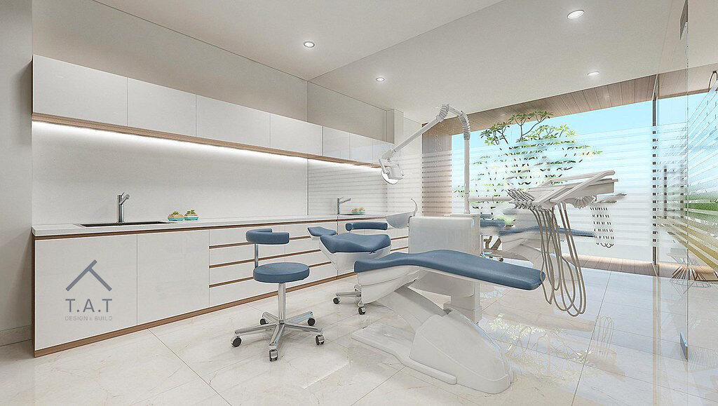 Không gian phòng khám mang lại sự sạch sẽ, chuyên nghiệp với tông màu trắng tinh khôi, thêm vào đó, sự bổ sung màu xanh cho ghế và các đường viền tủ bằng gỗ vừa tạo nên sự an tâm về tính chuyên nghiệp cũng như tăng phần ấm áp cho không gian.