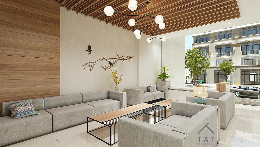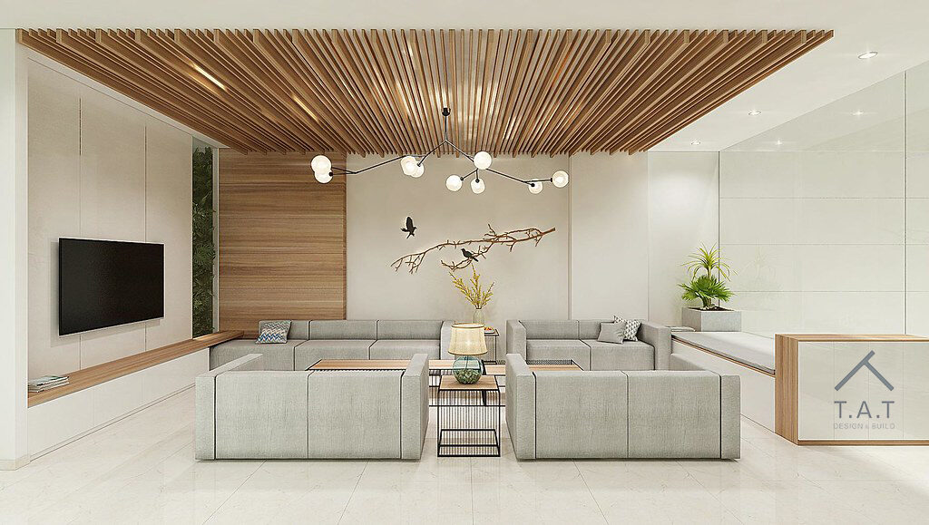 Thiết kế trần lam gỗ chạy dọc không chỉ tạo chiều sâu cho không gian mà còn khéo léo che đi các hệ thống kỹ thuật (điều hòa, PCCC) phía trên, đồng thời hỗ trợ tiêu âm tốt cho khu vực sảnh.