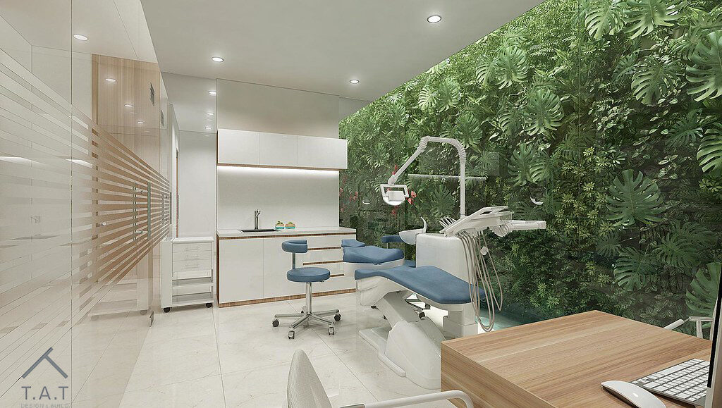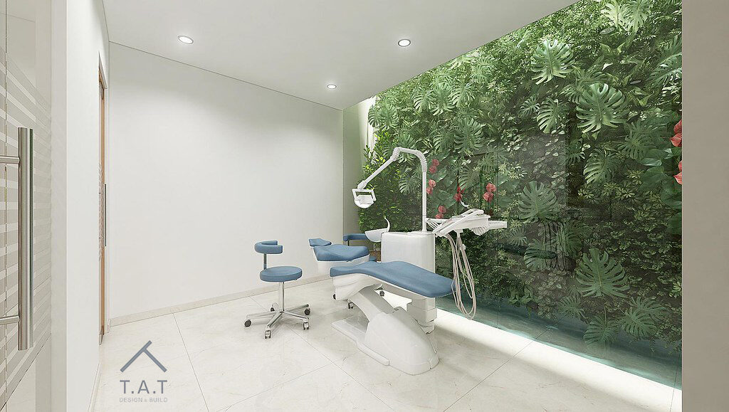 Thay vì một bức tường đặc, không gian mở ra một mảng xanh đứng (Vertical Garden) lớn sau lưng ghế nha. Đây có thể là tường cây thật hoặc cây giả cao cấp tích hợp hệ thống chiếu sáng chuyên dụng.