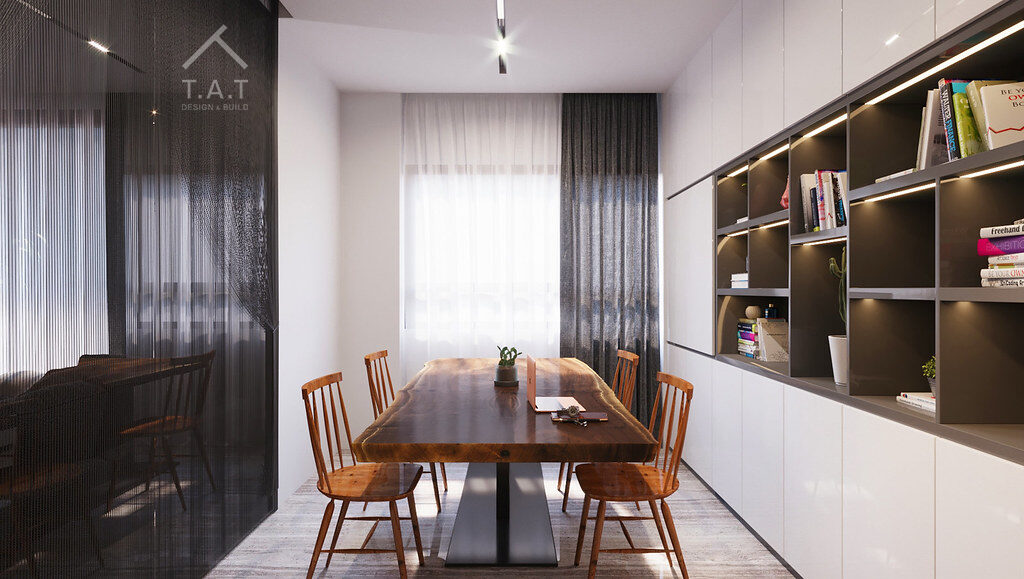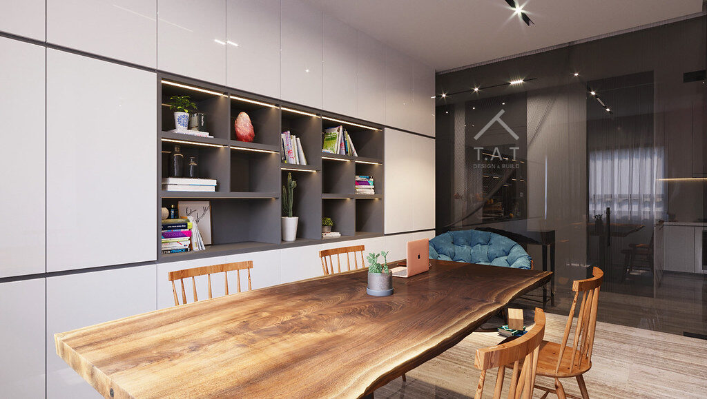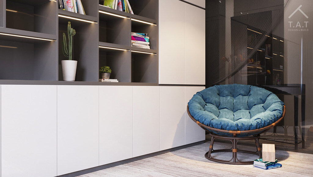 Với tông màu chủ đạo, tiếp nối tông xám đen và trắng của phòng khách nhưng tăng cường độ tối để tạo sự tập trung với điểm nhấn sắc gỗ nâu từ hệ kệ sách và bàn làm việc giúp làm dịu đi cảm giác lạnh của kính và kim loại, tạo môi trường ấm cúng cho các hoạt động trí óc.