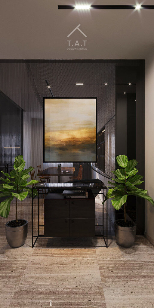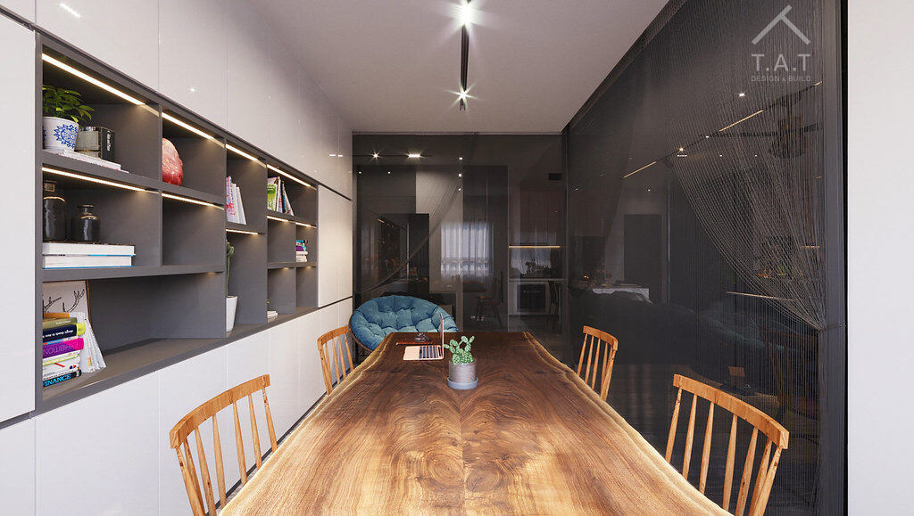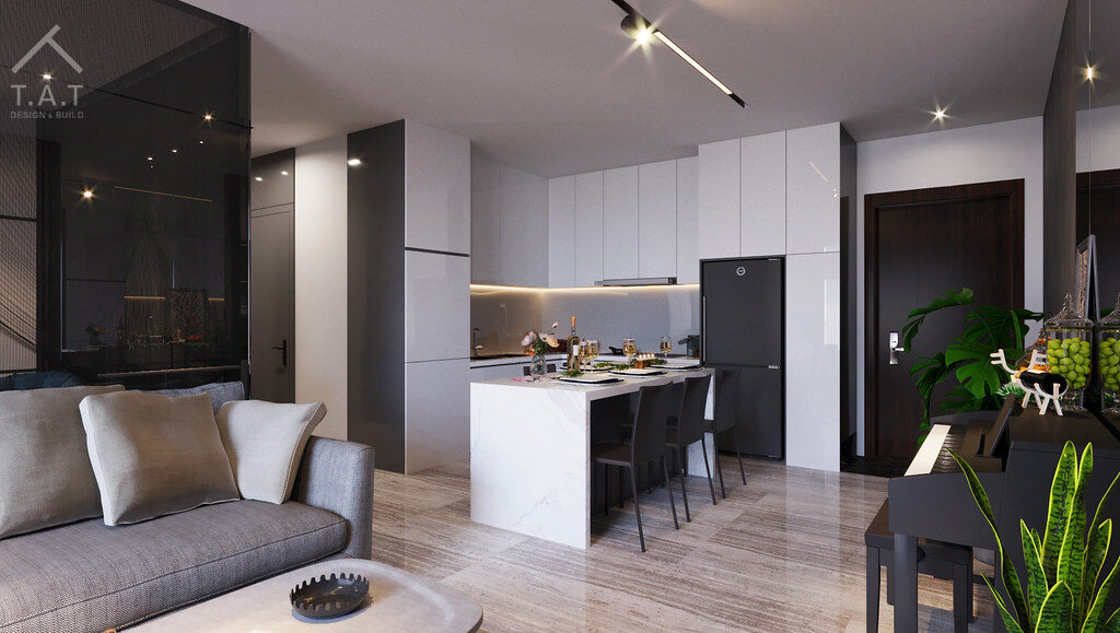 Tông màu trong căn hộ mang thiên hướng trầm hơn với màu chủ đạo: Dark Gray & White Contrast