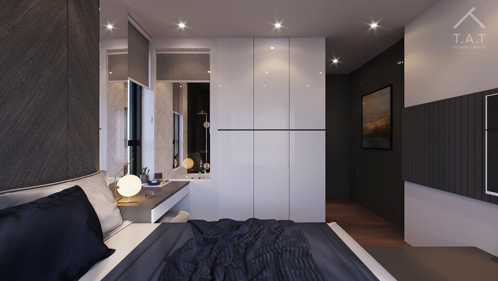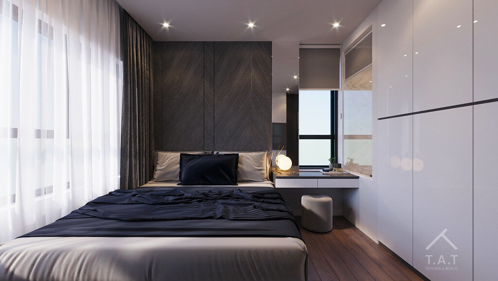 Cách xử lý vật liệu ở đây rất thông minh, đặc biệt là việc lặp lại chất liệu gương đen từ phòng khách vào phòng ngủ. Điều này tạo ra một sợi dây liên kết vô hình về phong cách thiết kế cho toàn bộ căn hộ, khẳng định gu thẩm mỹ nhất quán và sự chỉn chu trong thi công.