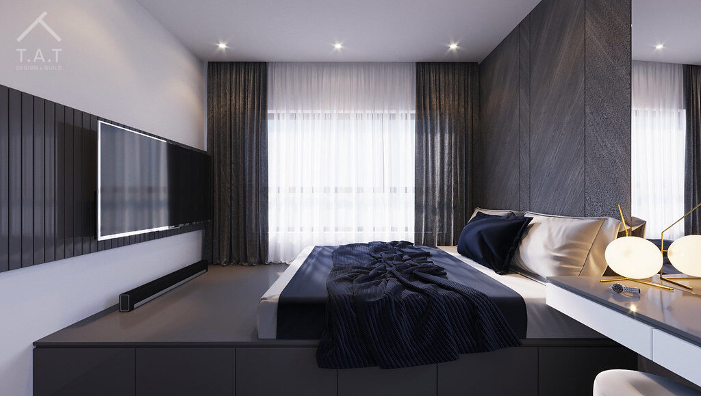 Tông màu chủ đạo có thể thấy là monochromatic elegance (sự thanh lịch đơn sắc), gồm sự kết hợp các sắc độ của màu xám (từ xám nhạt của tường đến xám than của vách đầu giường).
